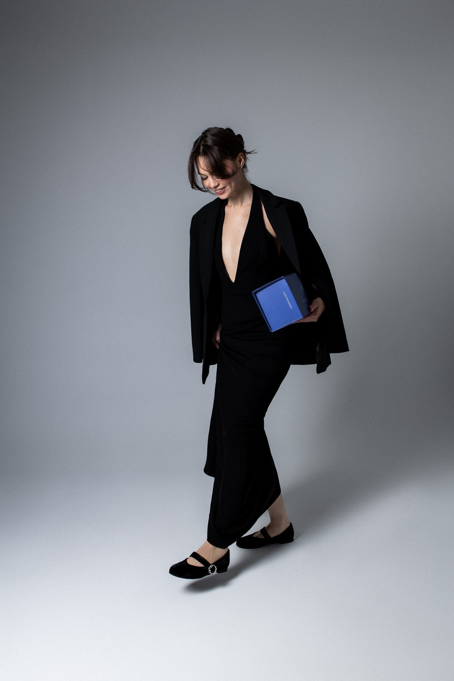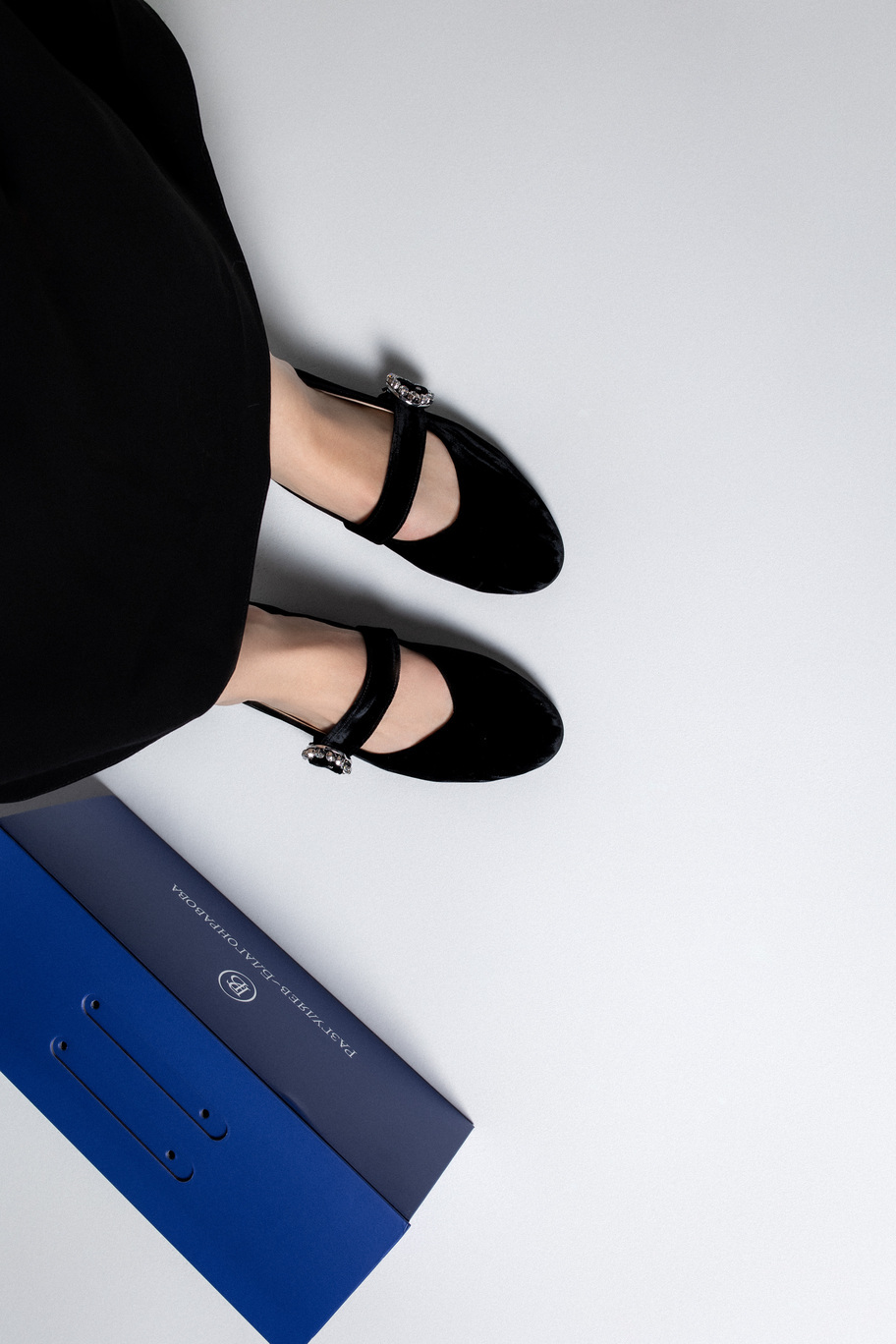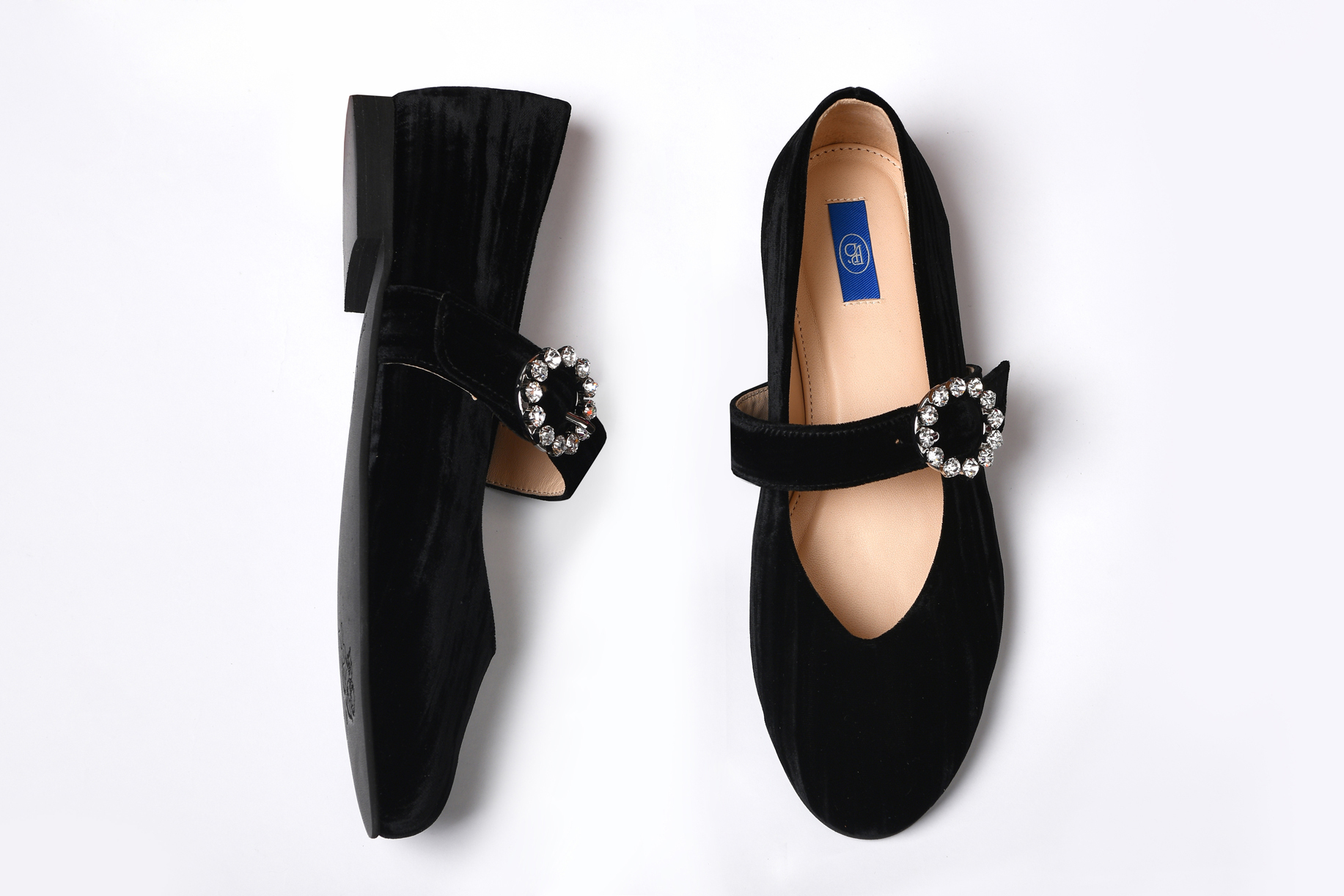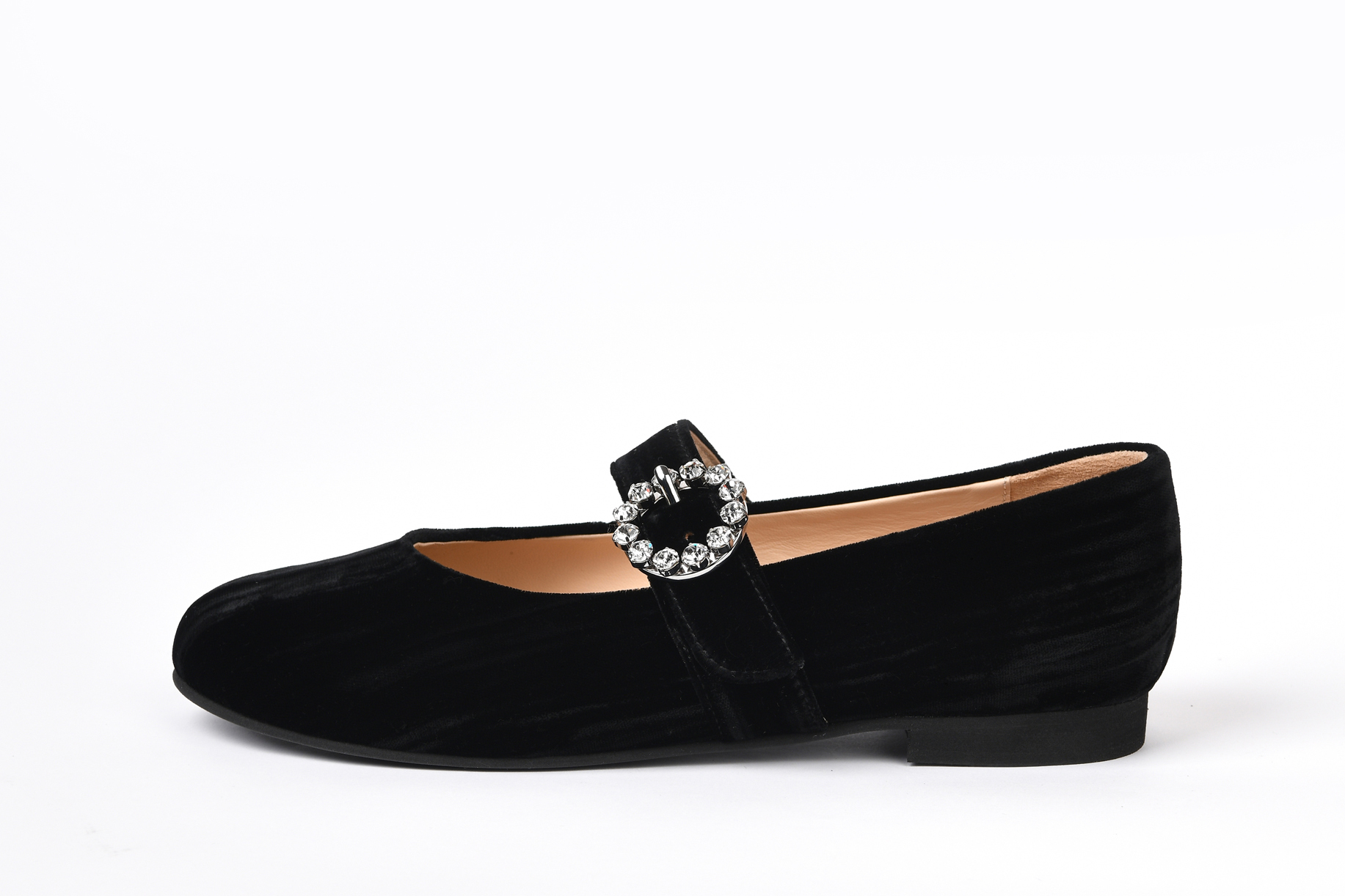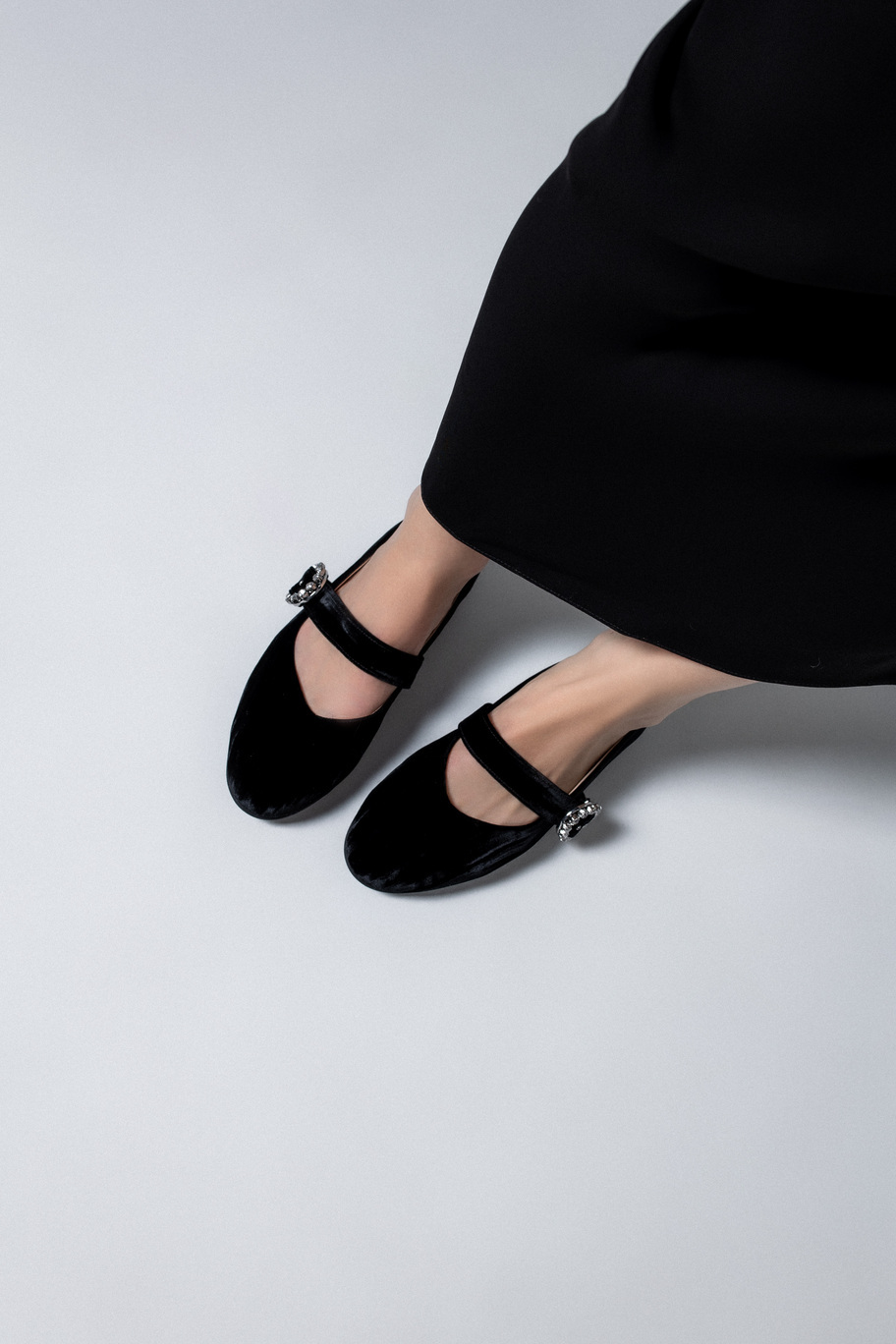 Балетки "Мэри Джейн" из благородного итальянского черного бархата с пряжкой, украшенной камнями.