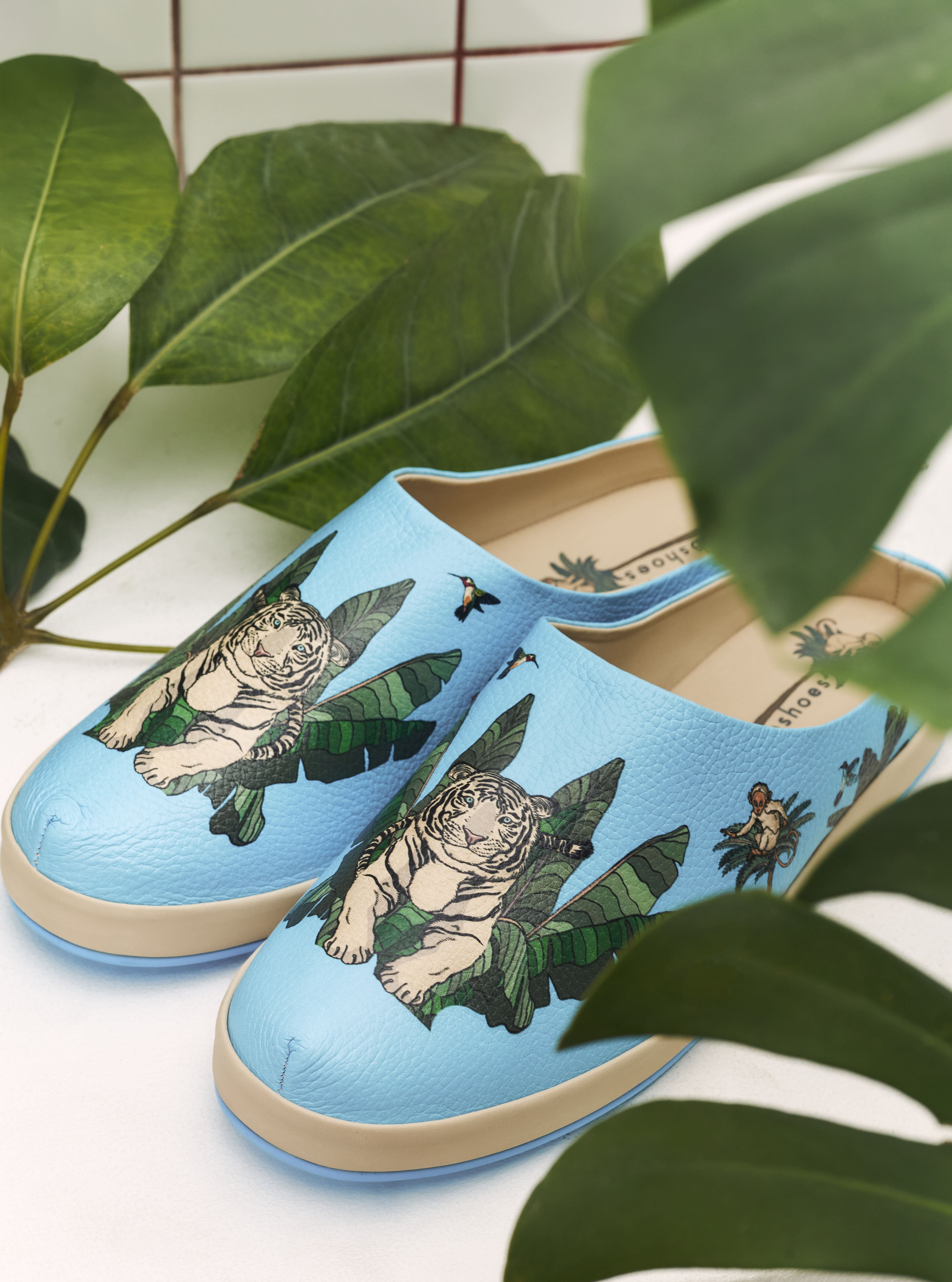 Выполненные вручную из натуральной кожи, они украшены принтом с бенгальским тигром и джунглями — символом силы, спокойствия и природной гармонии.