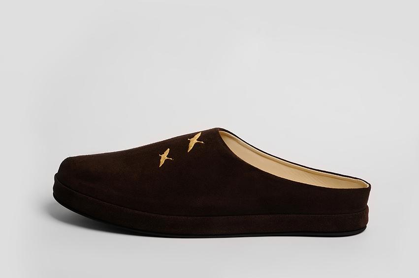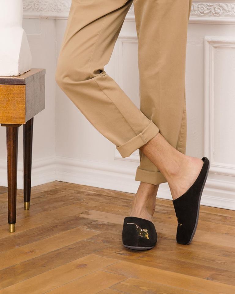 Невероятно мягкие и удобные мужские клоги (это новая версия домашних тапочек, которые можно и нужно носить на улицу) ручной работы из натуральной кожи с вышивкой: охотник стреляющий в уток.