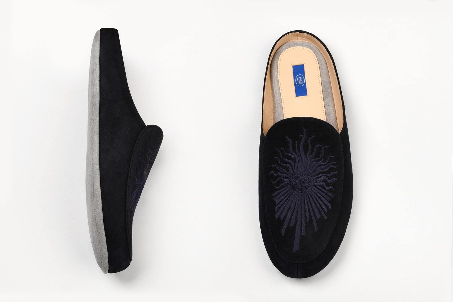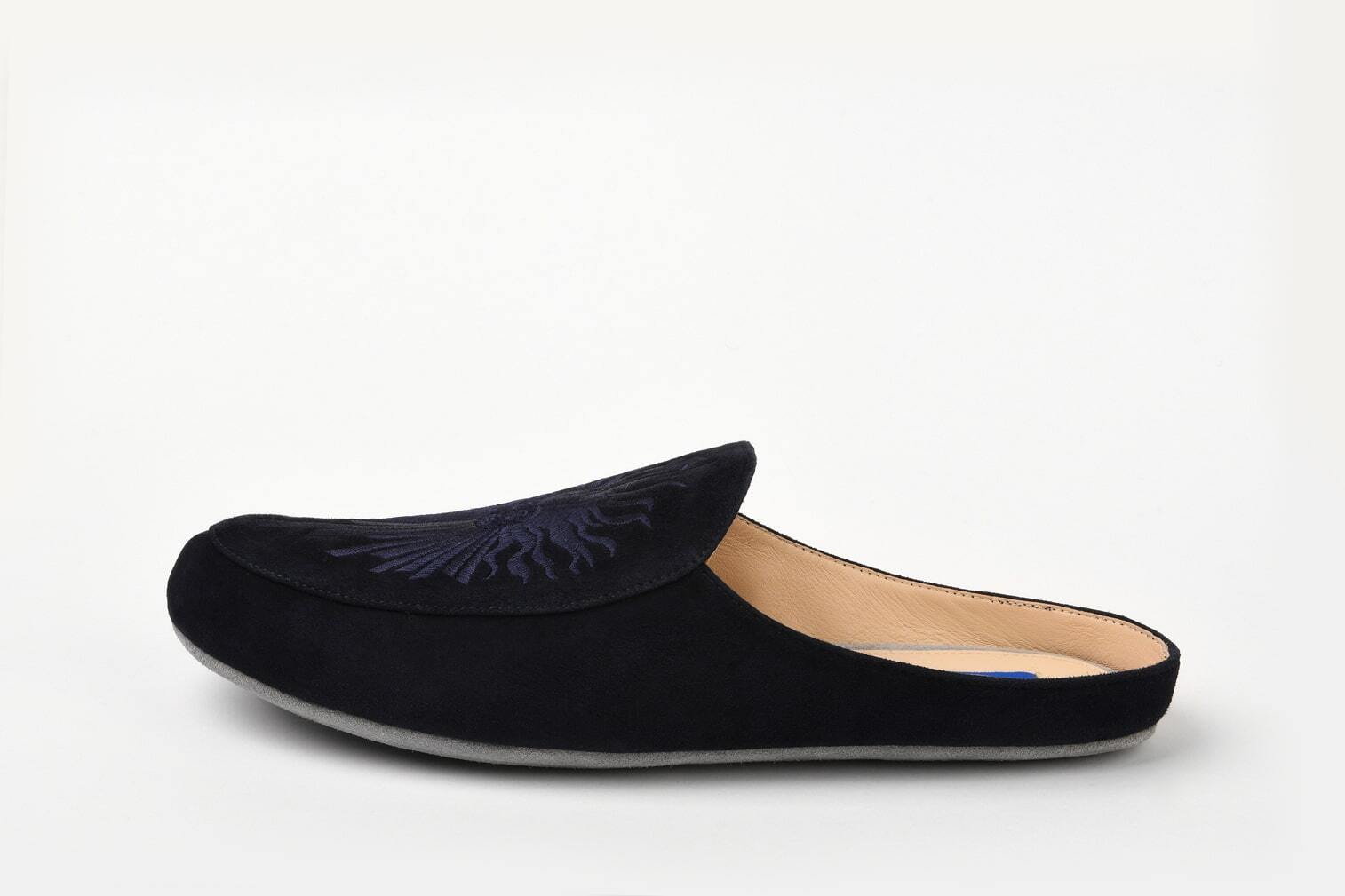 Тапочки из изысканной синей замши отсылают к эмблеме Людовика XIV — Короля-Солнце.