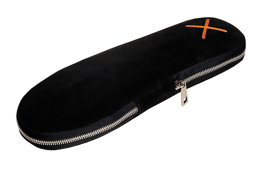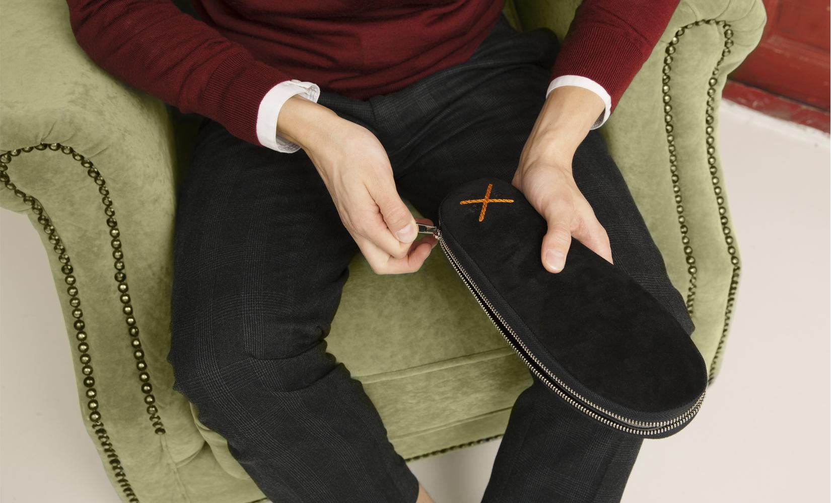 Чехол на молнии в сочетании кожи и велюра с вышивкой логотипа.
