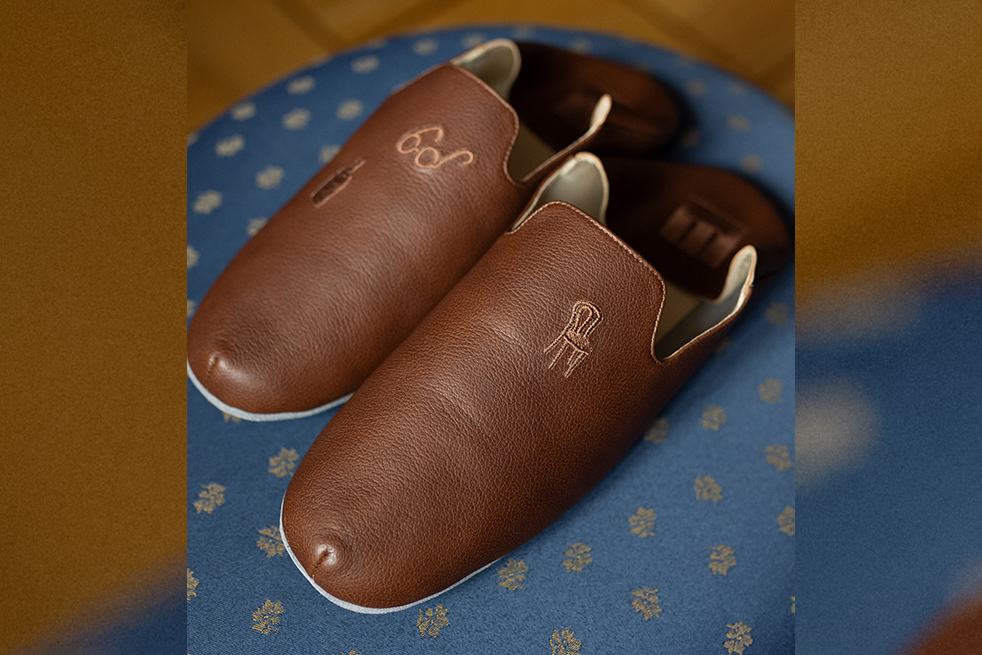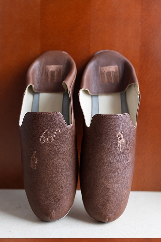 Тапочки выполнены из натуральной итальянской кожи, а вышивка на них вдохновлена символами эпохи кабаре и литературных салонов.