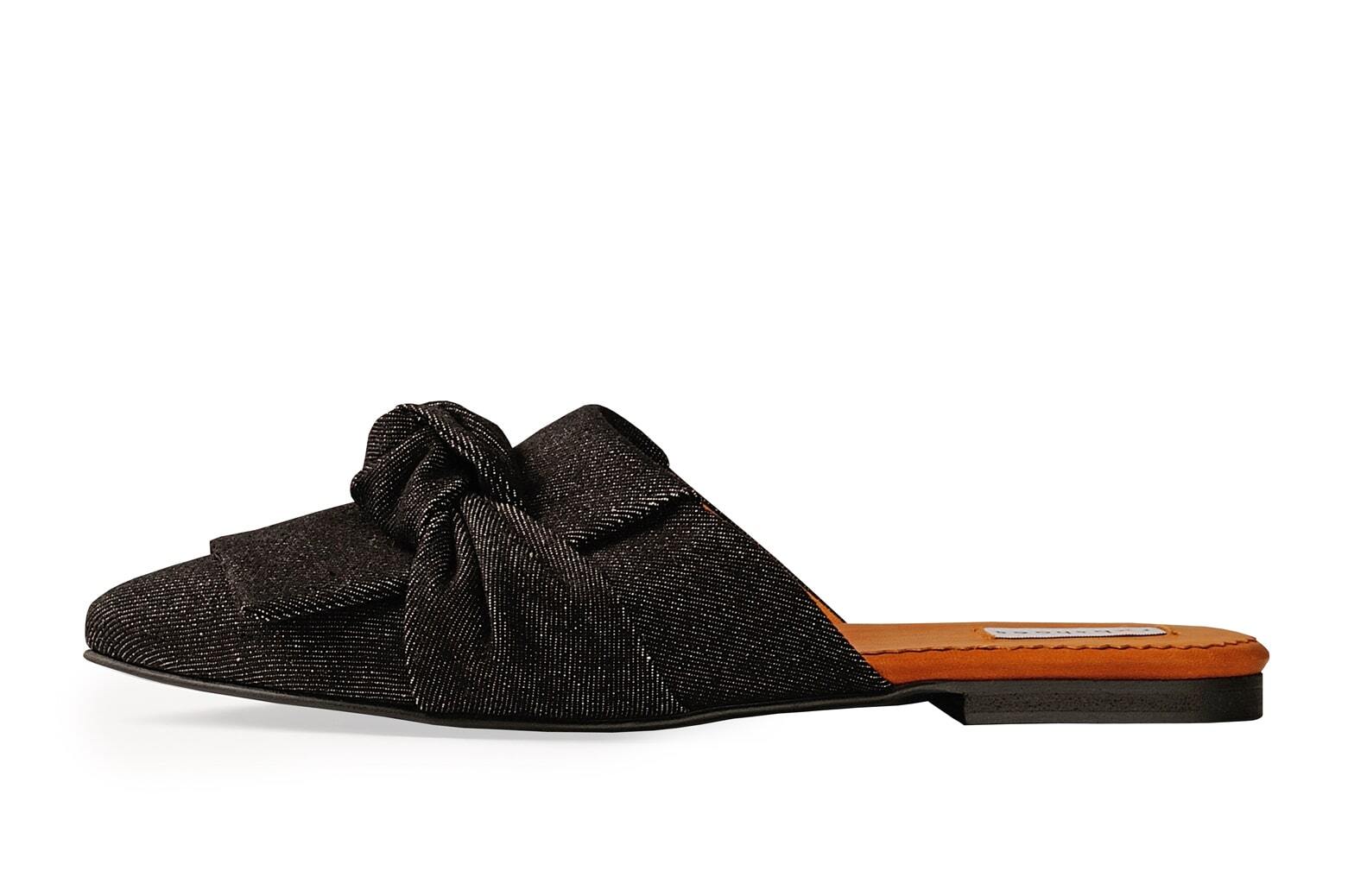 Завоевавшая популярность модель мюлей с острым носиком выполненная из джинсы серо-черного цвета с декором в виде узла.