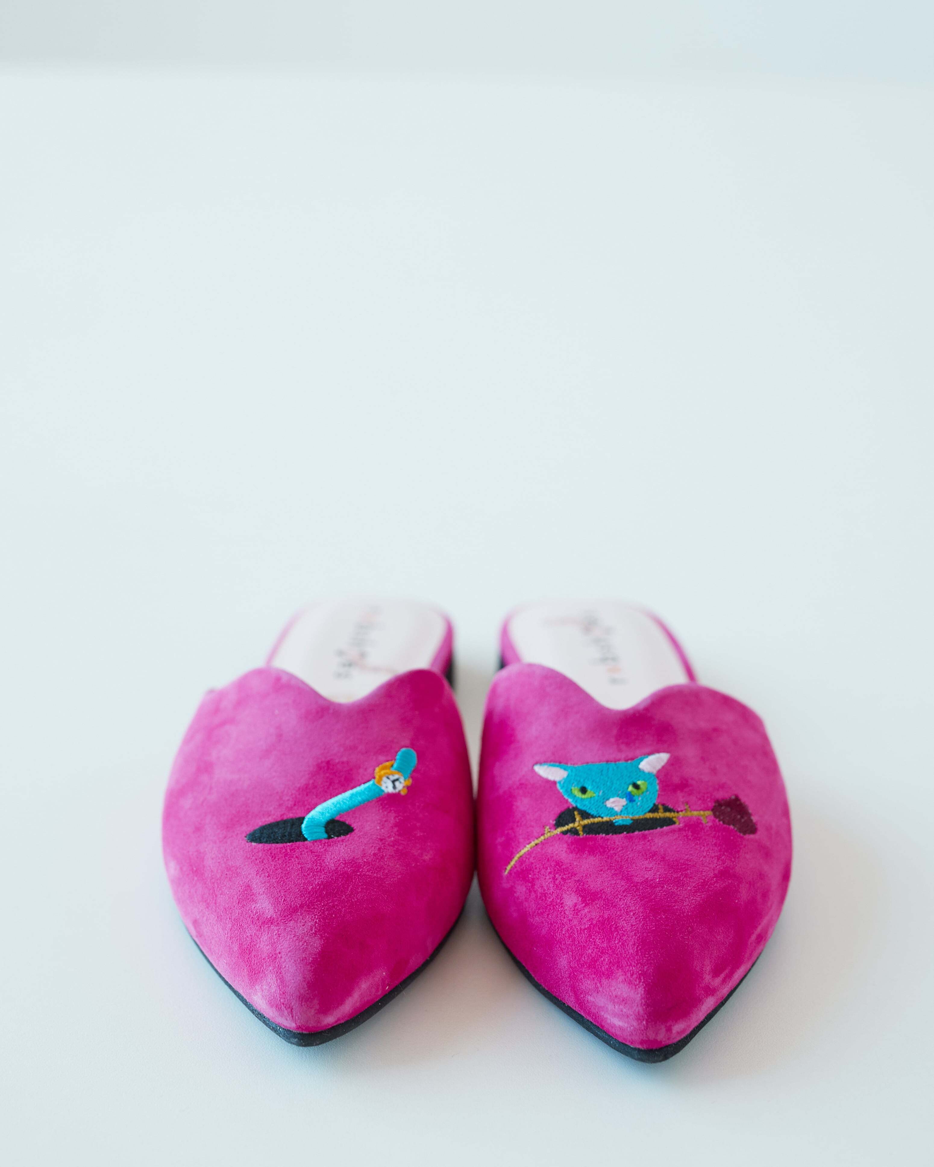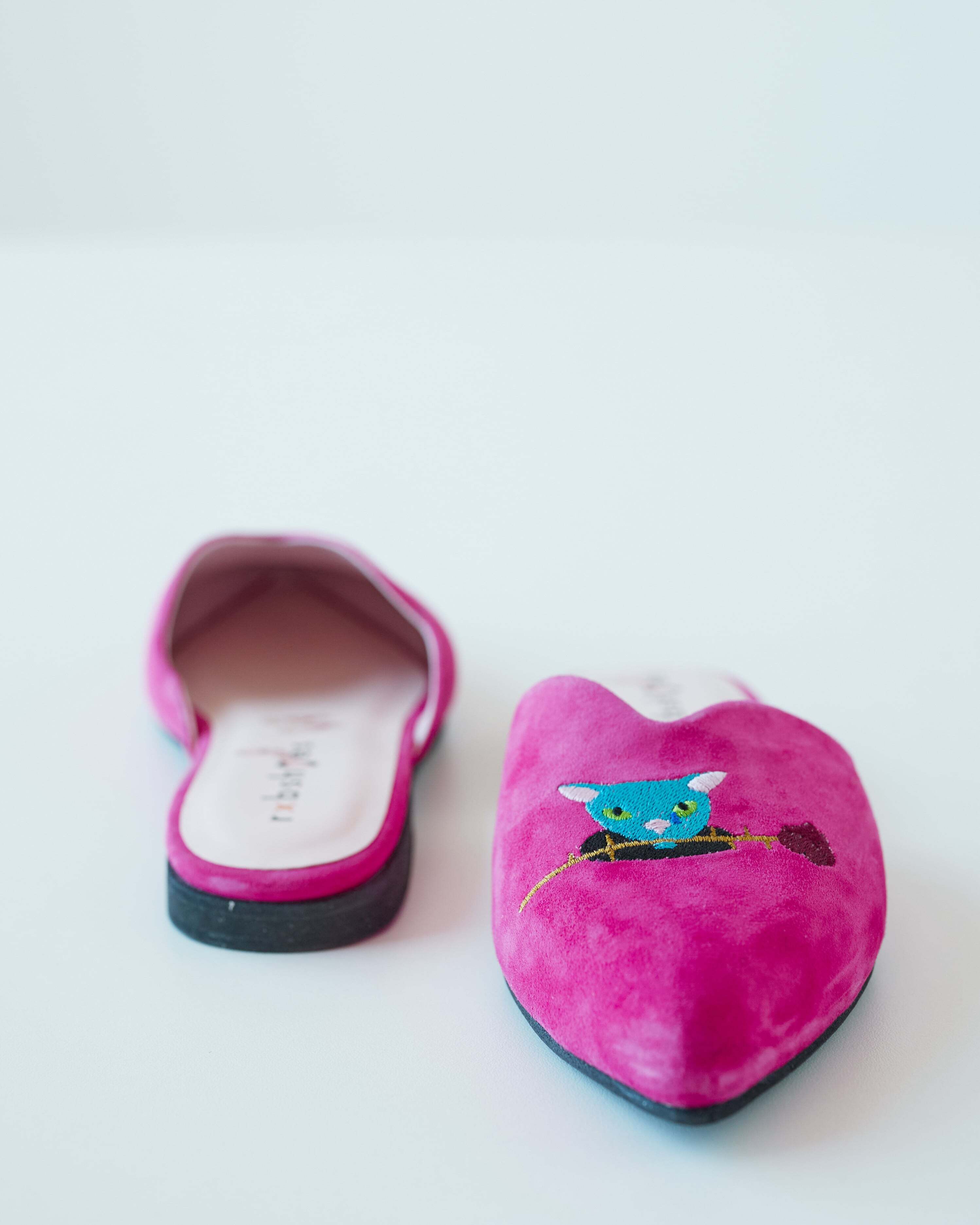 Мюли замшевые для дома и улицы с вышивкой- коллаборация с театральным художником Сергеем Кретенчуком, который отправляет нас в мир любимых с детства мультфильмов с философскими сюжетами. Котик несет розу возлюбленной, колючие шипы вызывают слезу, но котик не отпускает цветочек приготовленный самому дорогому человеку.