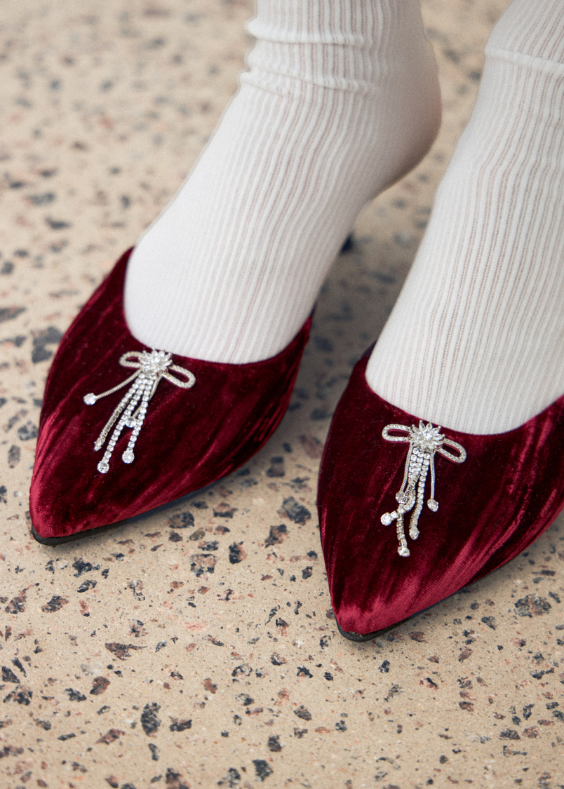 Итальянский бархат с мягким благородным переливом. Сверкающая брошь ручной работы, надежно закрепленная на мысе специальным обувным креплением.