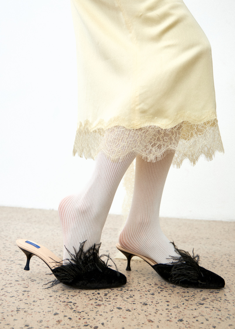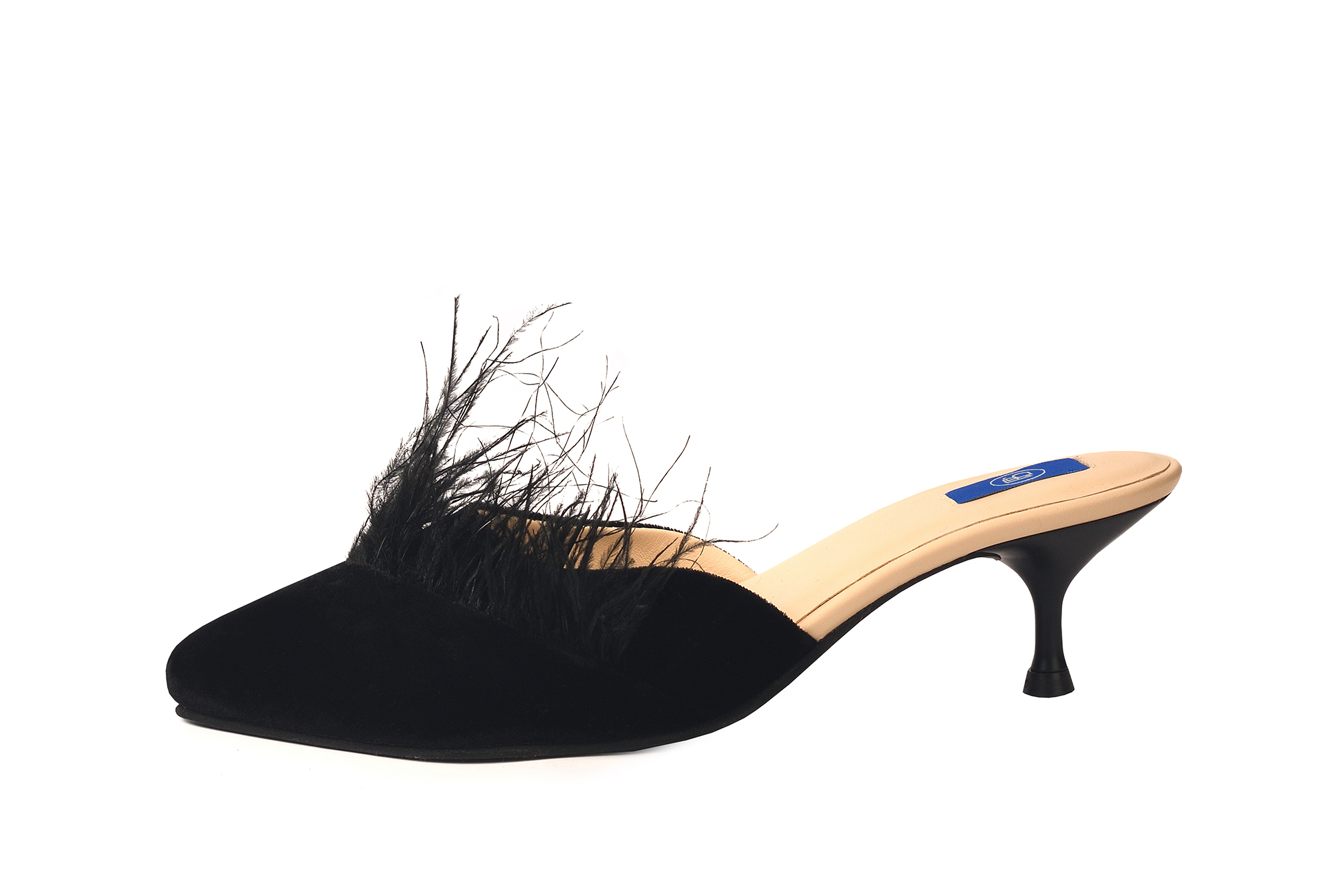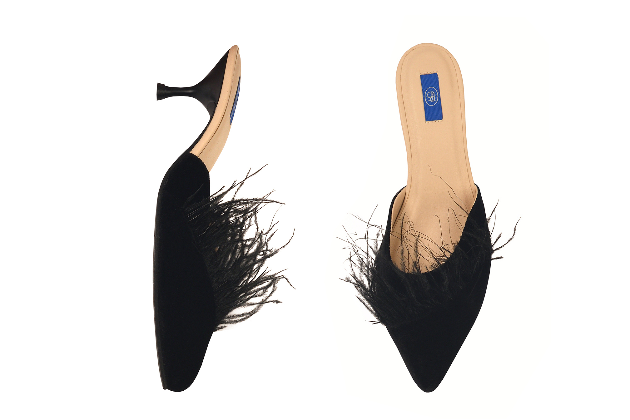 Глубокий чёрный бархат премиум-класса, изящный и пышные страусиные перья — эти мюли созданы для тех, кто любит быть в центре внимания, но без лишнего шума.