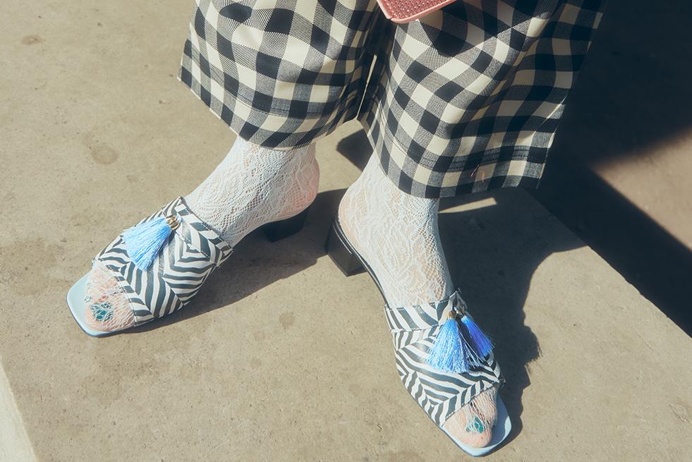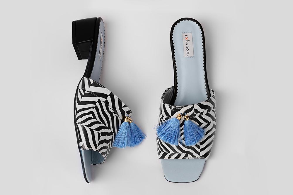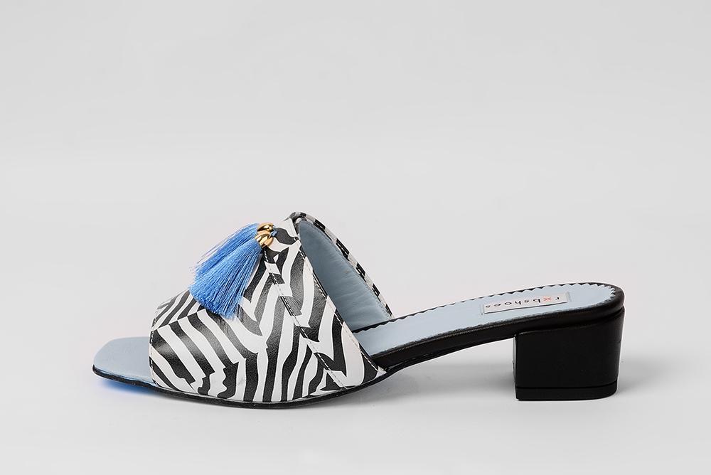 Мюли с принтом Сони Дэлоне с кисточками, с открытым носиком на небольшом, устойчивом каблуке обтянутым кожей. Отличительной особенностью этой коллекции является голубая подошва.
