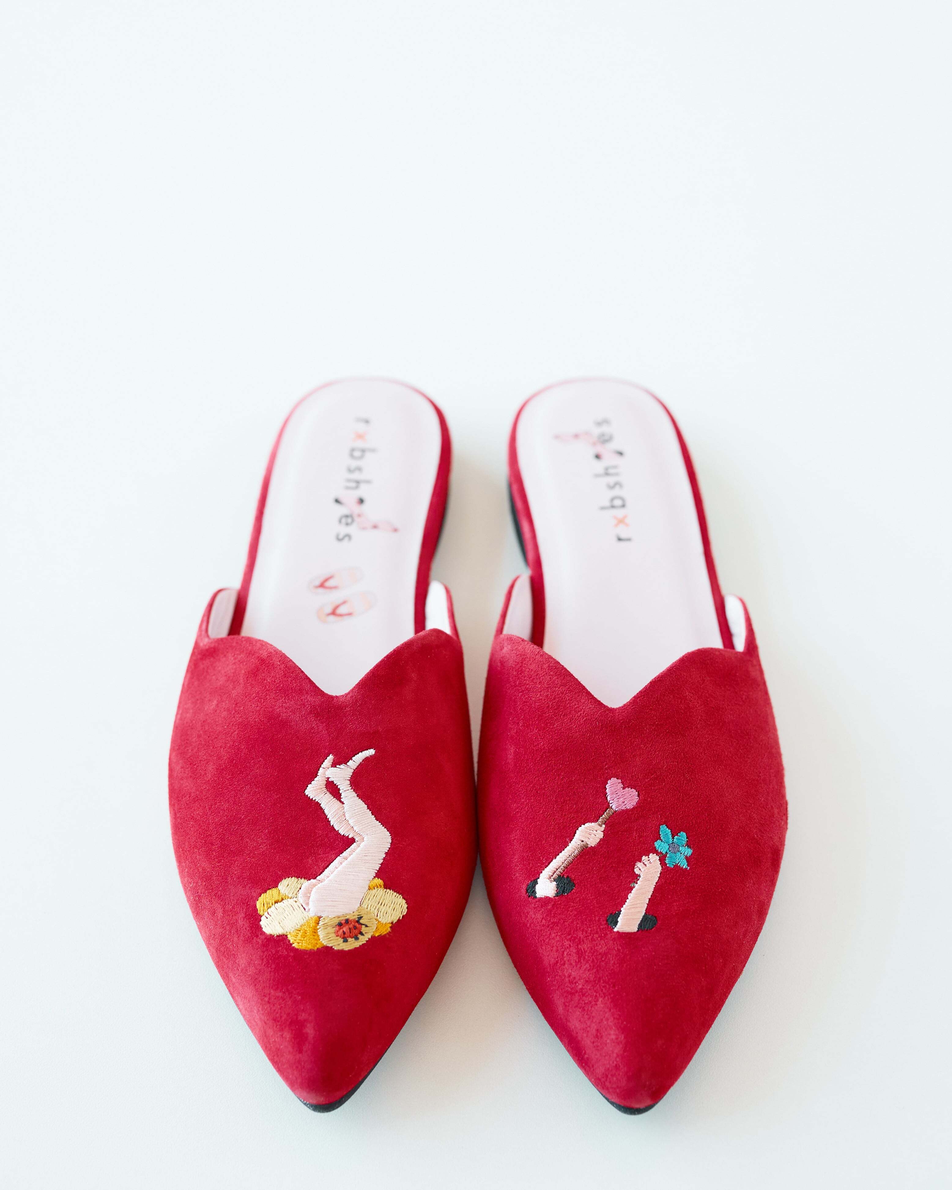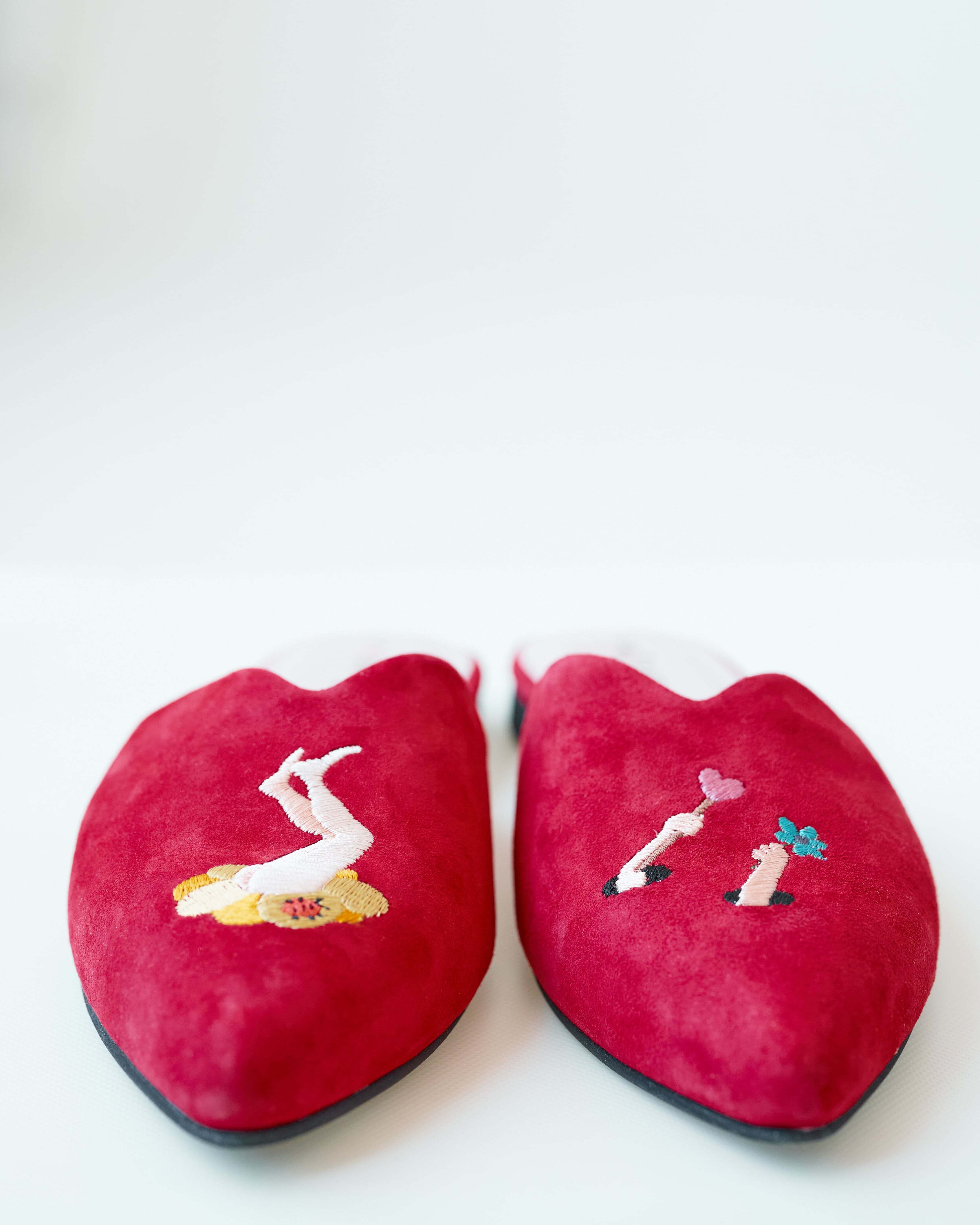 Мюли замшевые для дома и улицы с вышивкой- коллаборация с театральным художником Сергеем Кретенчуком, который отправляет нас в мир любимых с детства мультфильмов с философскими сюжетами.