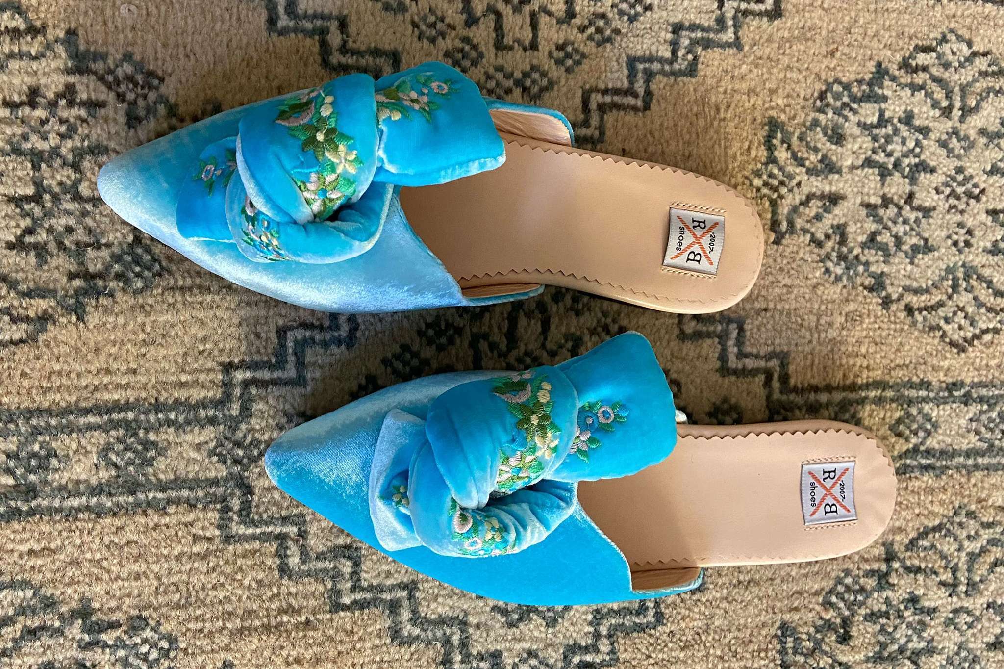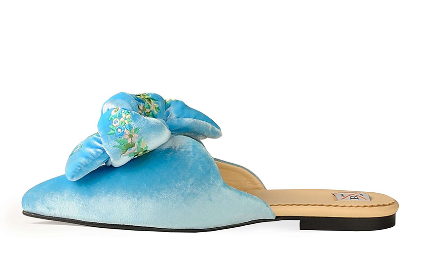 Нежные лазурные мюли из шелкового бархата с бантом и цветочной вышивкой — станут лучшим завершением любого образа. Будь то джинсы и футболка, укороченные брюки и блузка, милое нежно платье. Носите как дома так и на улице и привлекайте внимание окружающих. Днем вам будет комфортно и удобно в мюлях, а вечером можете смело переобуваться в каблуки.