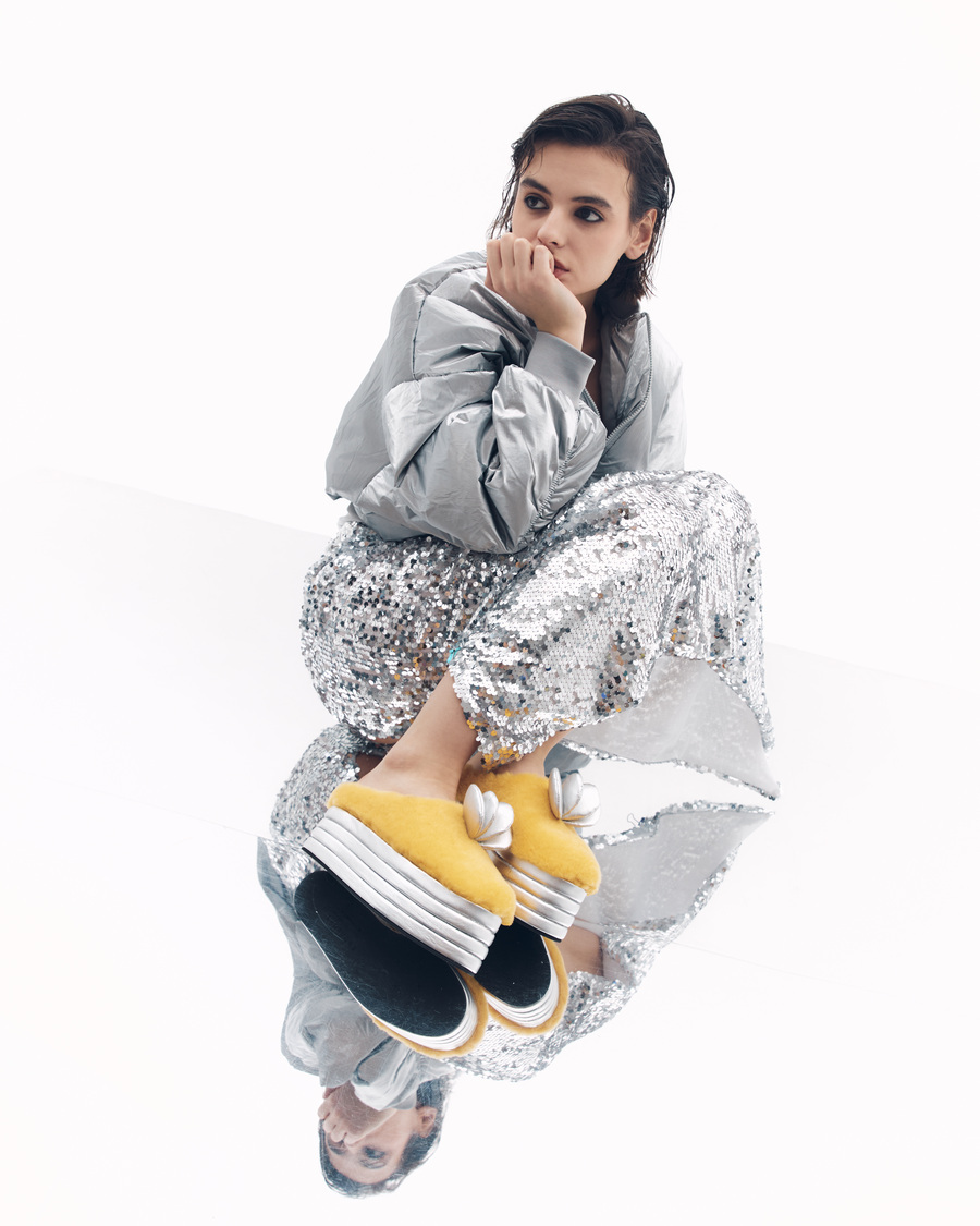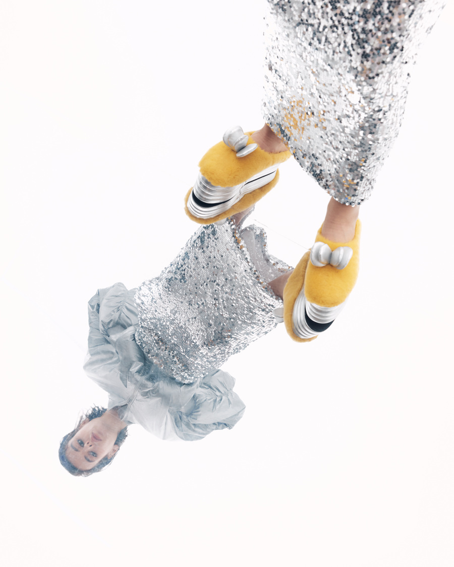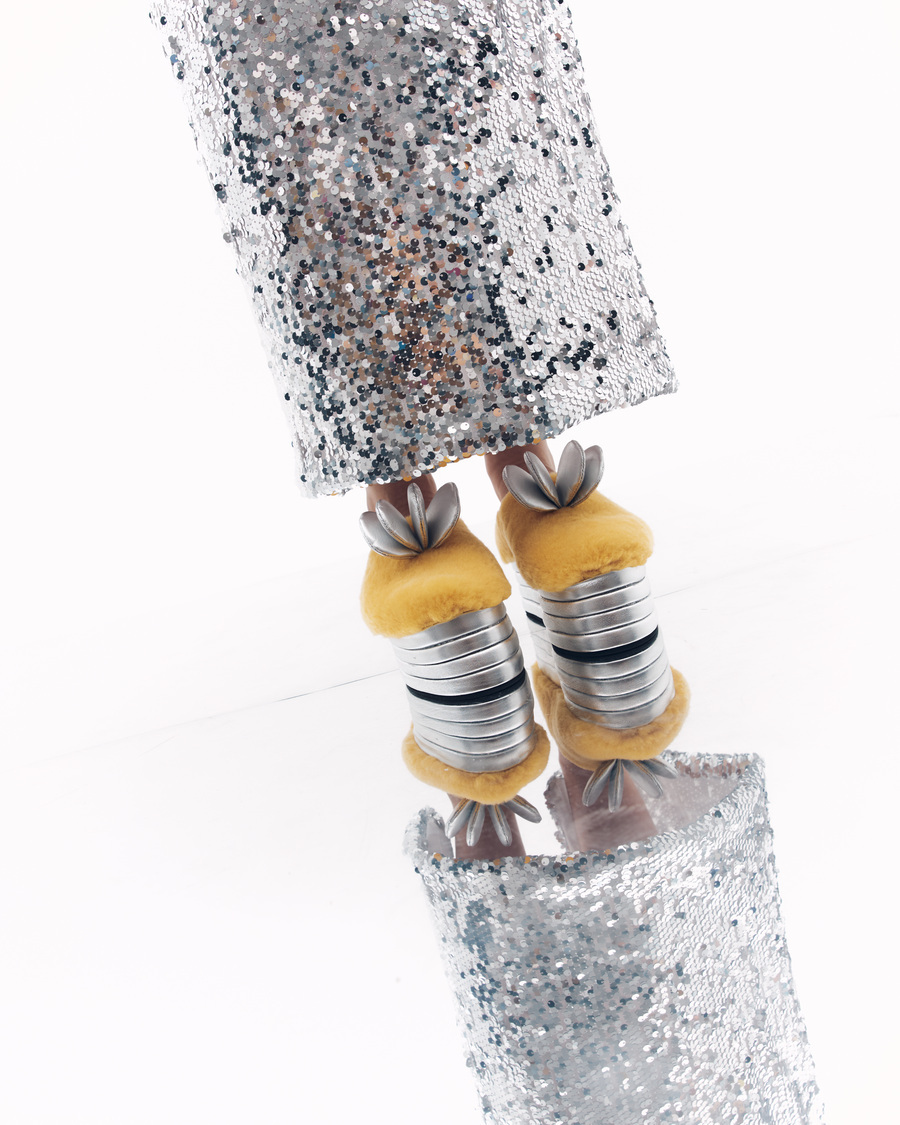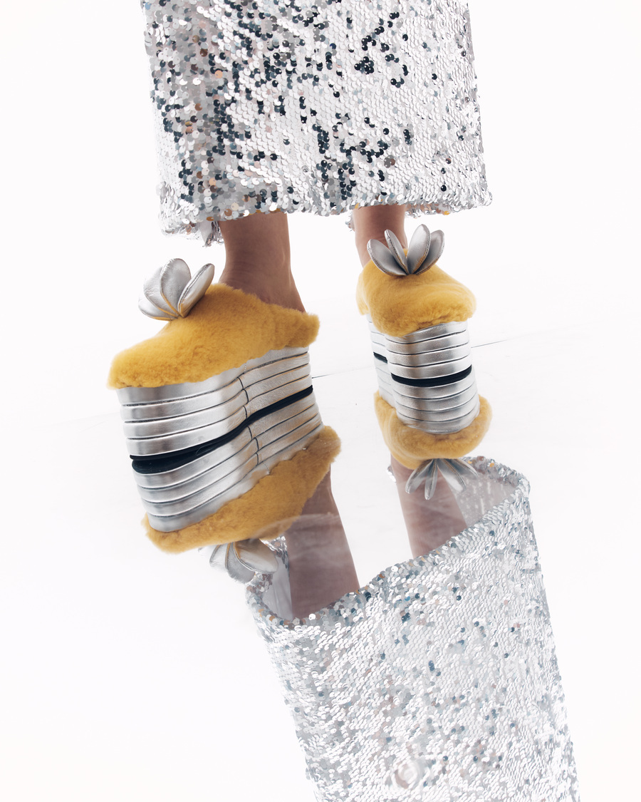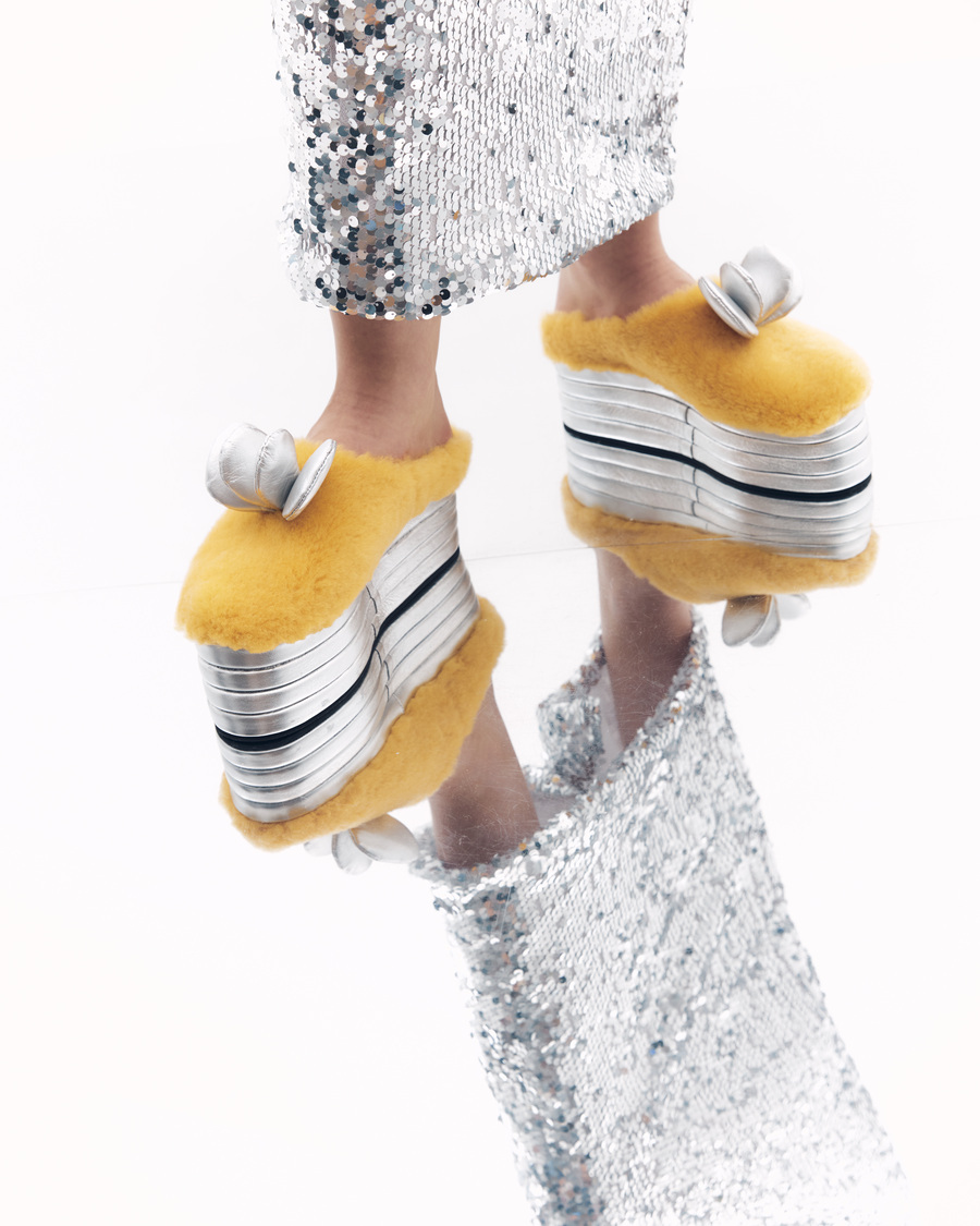 Уникальная модель, созданная в диалоге с легендарными туфлями Rainbow 1938г. Сальвадора Феррагамо. Сочетание серебряной кожи и роскошного двустороннего меха стриженного козлика на массивной платформе напоминает одновременно о японской эстетике сабо и золотом веке моды.