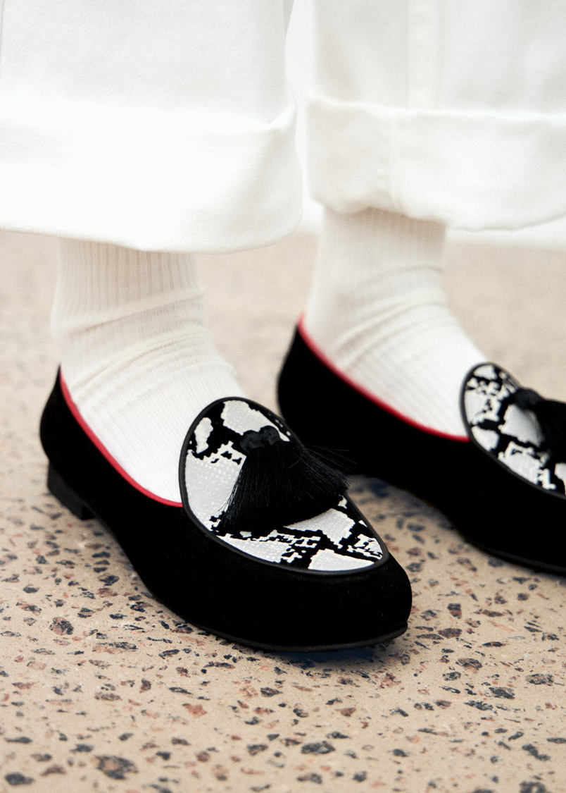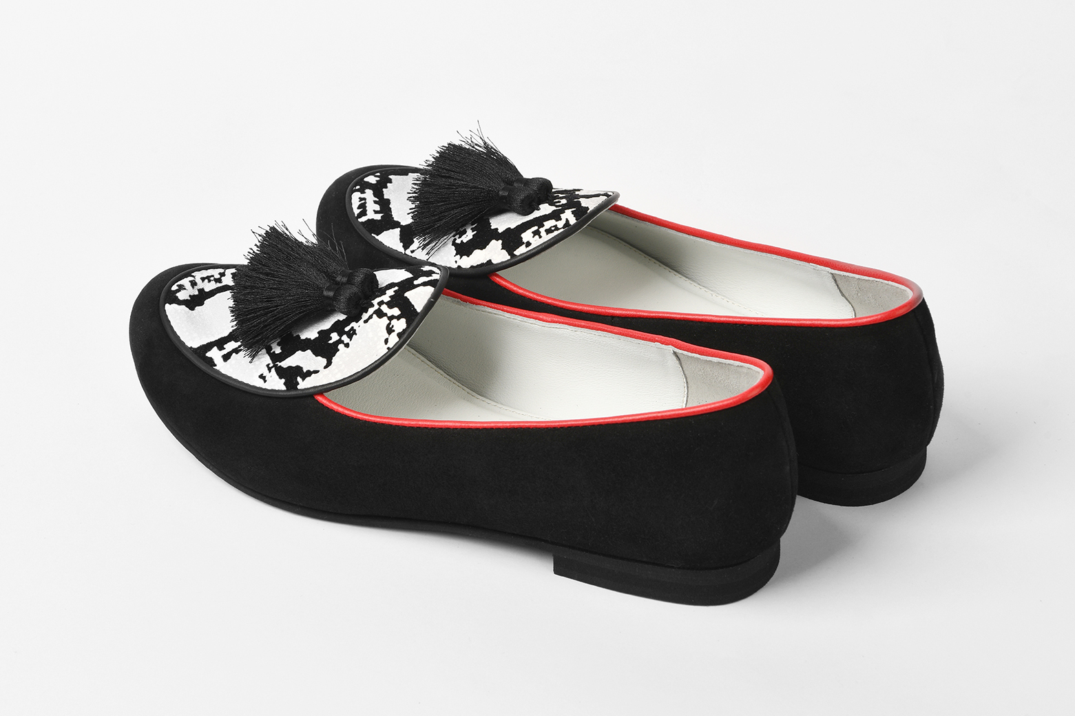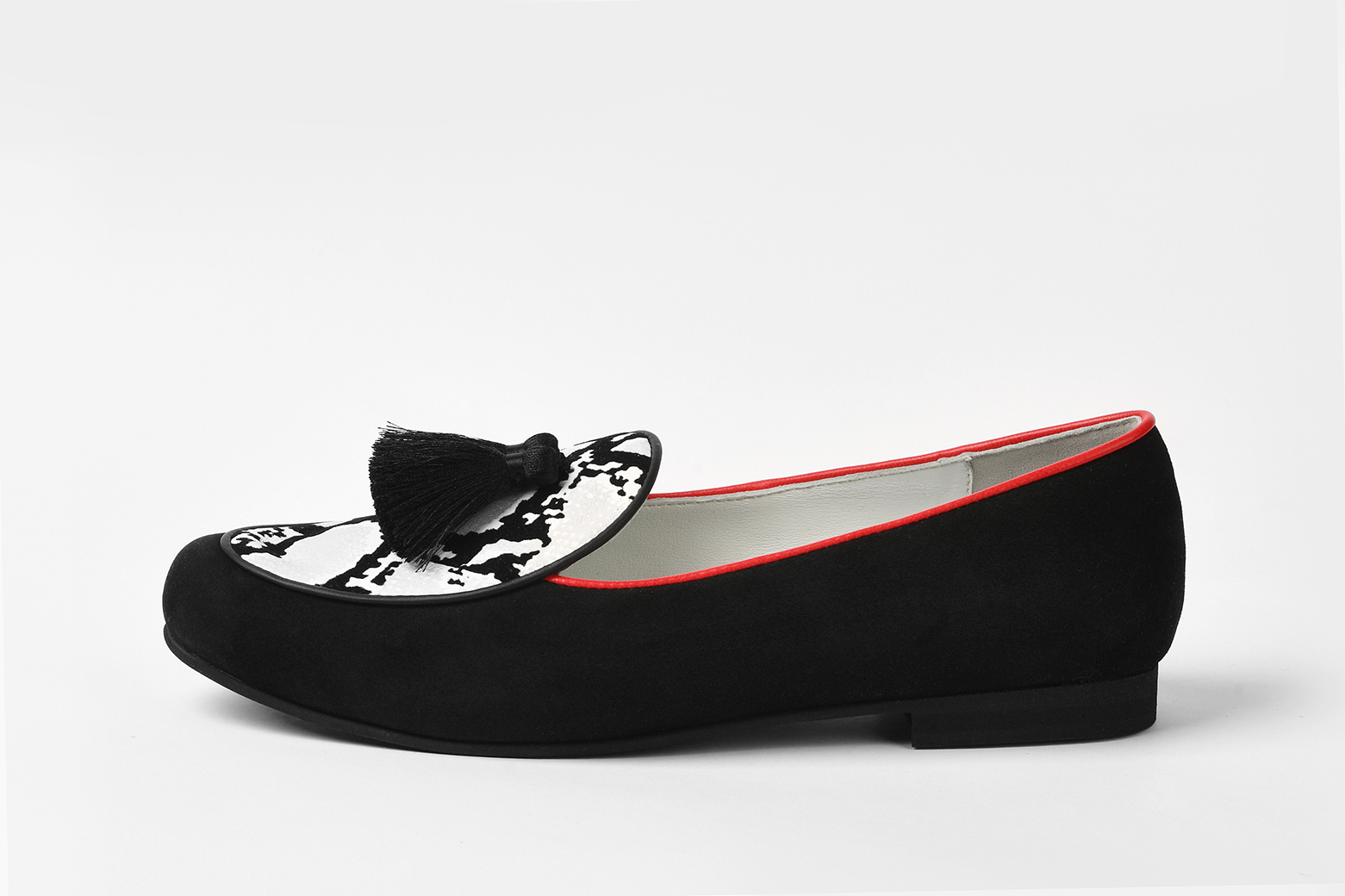Уникальная пара, сочетающая в себе строгость черной бархатистой замши и экспрессию графичного черно-белого принта. Яркая красная окантовка по канту придает модели динамичность, а декоративные текстильные кисточки добавляют классическому силуэту нотку аристократизма.