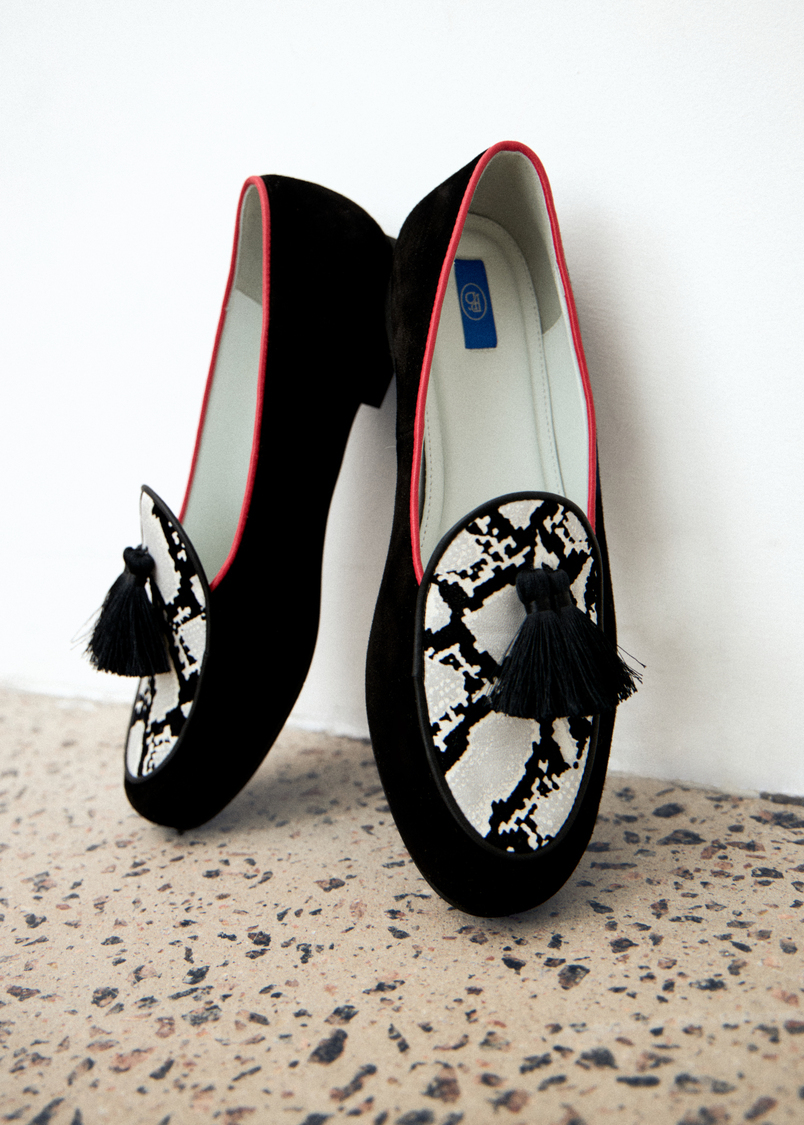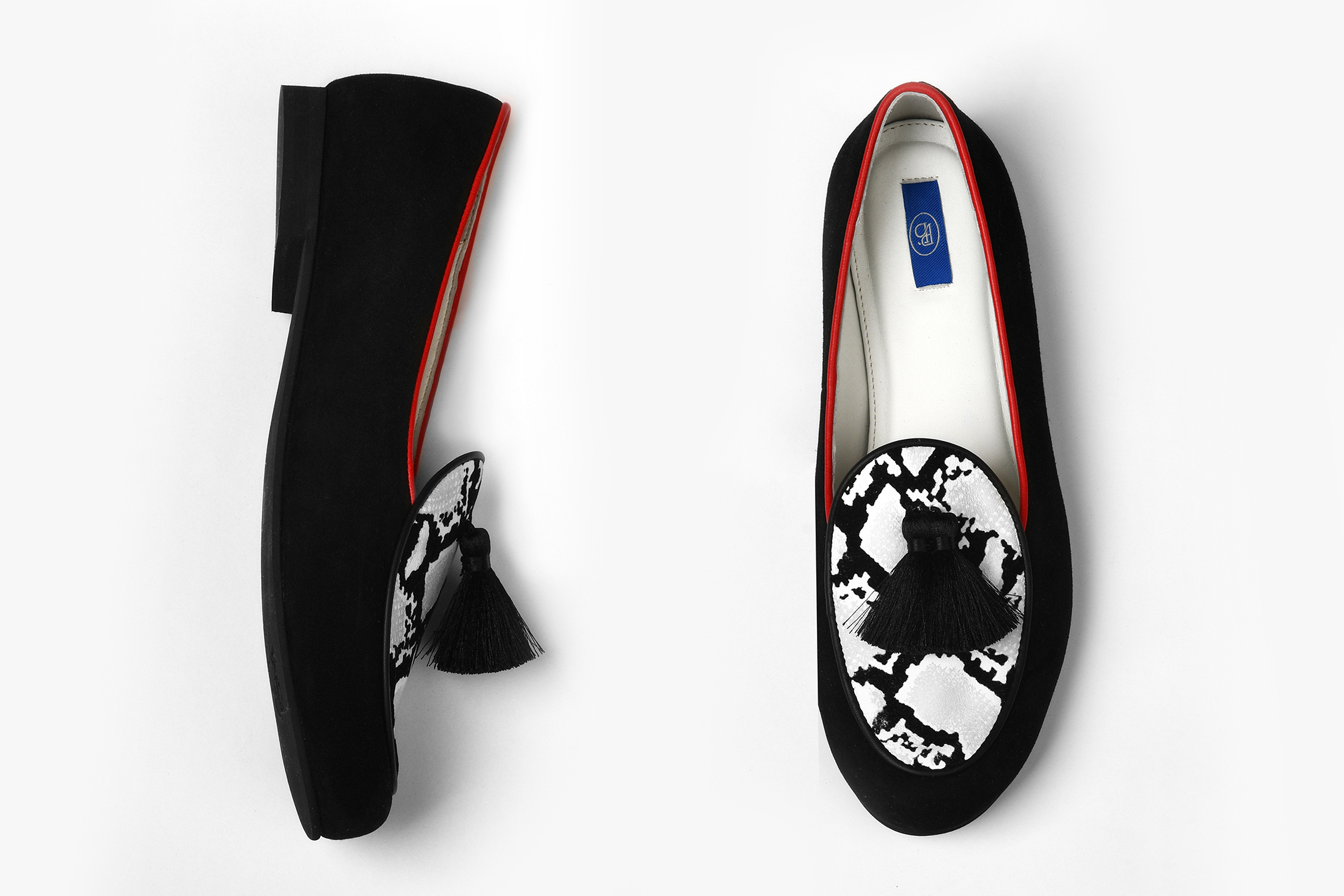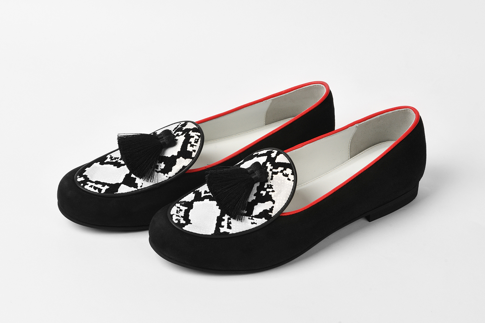 Уникальная пара, сочетающая в себе строгость черной бархатистой замши и экспрессию графичного черно-белого принта. Яркая красная окантовка по канту придает модели динамичность, а декоративные текстильные кисточки добавляют классическому силуэту нотку аристократизма.