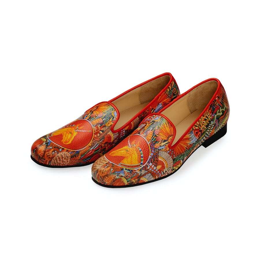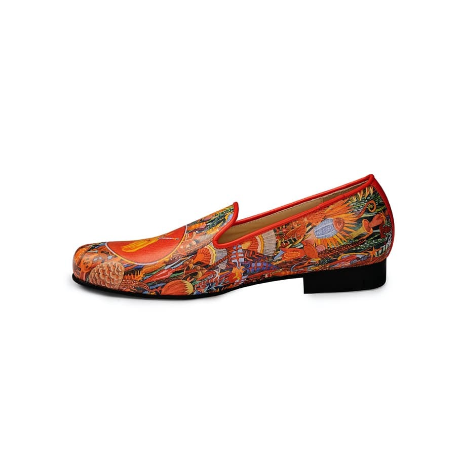 Уникальная пара, сочетающая в себе строгость черной бархатистой замши и экспрессию графичного черно-белого принта. Яркая красная окантовка по канту придает модели динамичность, а декоративные текстильные кисточки добавляют классическому силуэту нотку аристократизма.