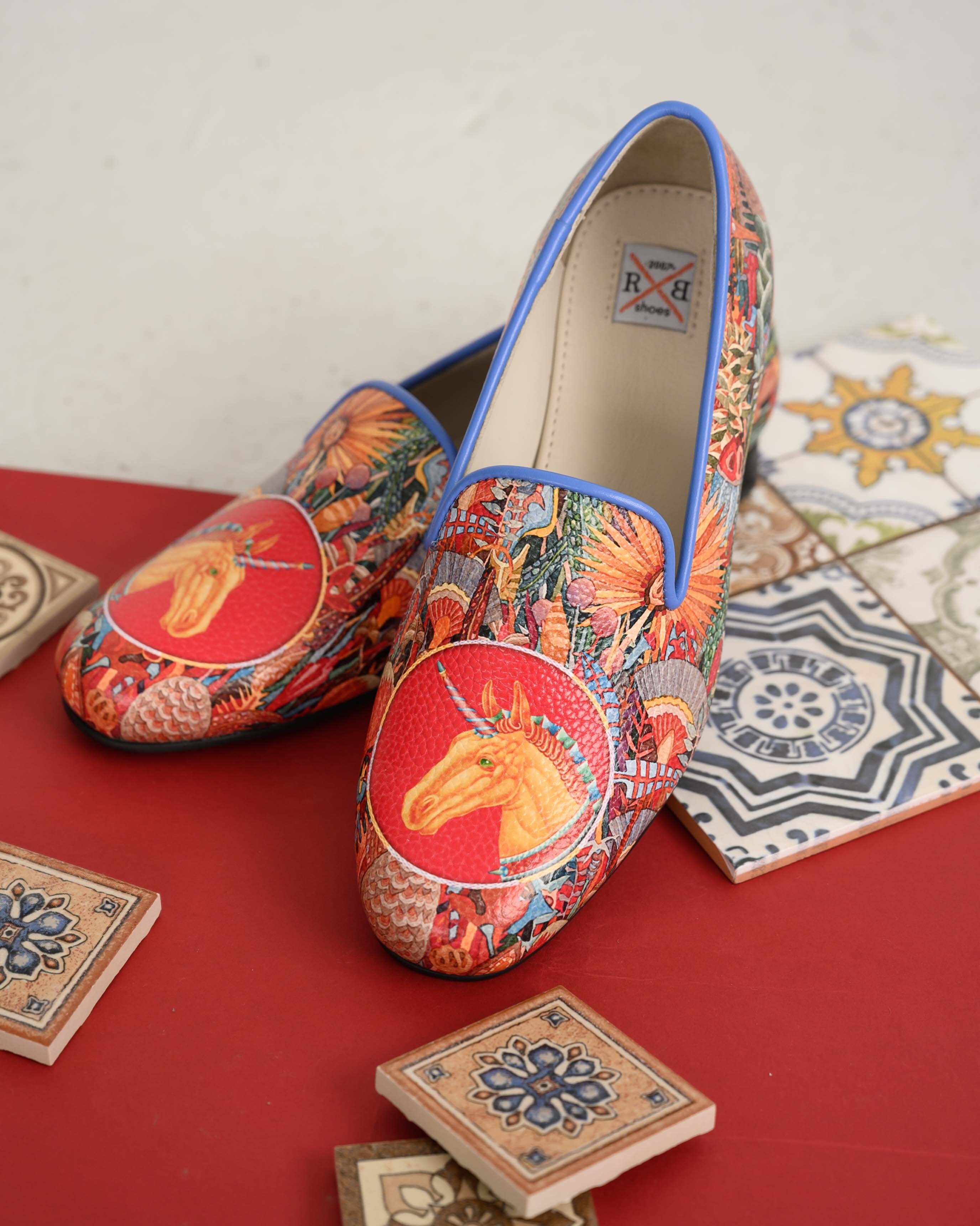Слиперы для дома и улицы "Единорог счастья" созданы по мотивам картины К. Овчинникова. Уникальный принт нанесен на мягчайшую итальянскую кожу, создавая яркий, но универсальный образ.