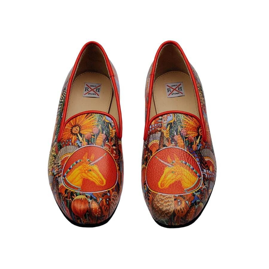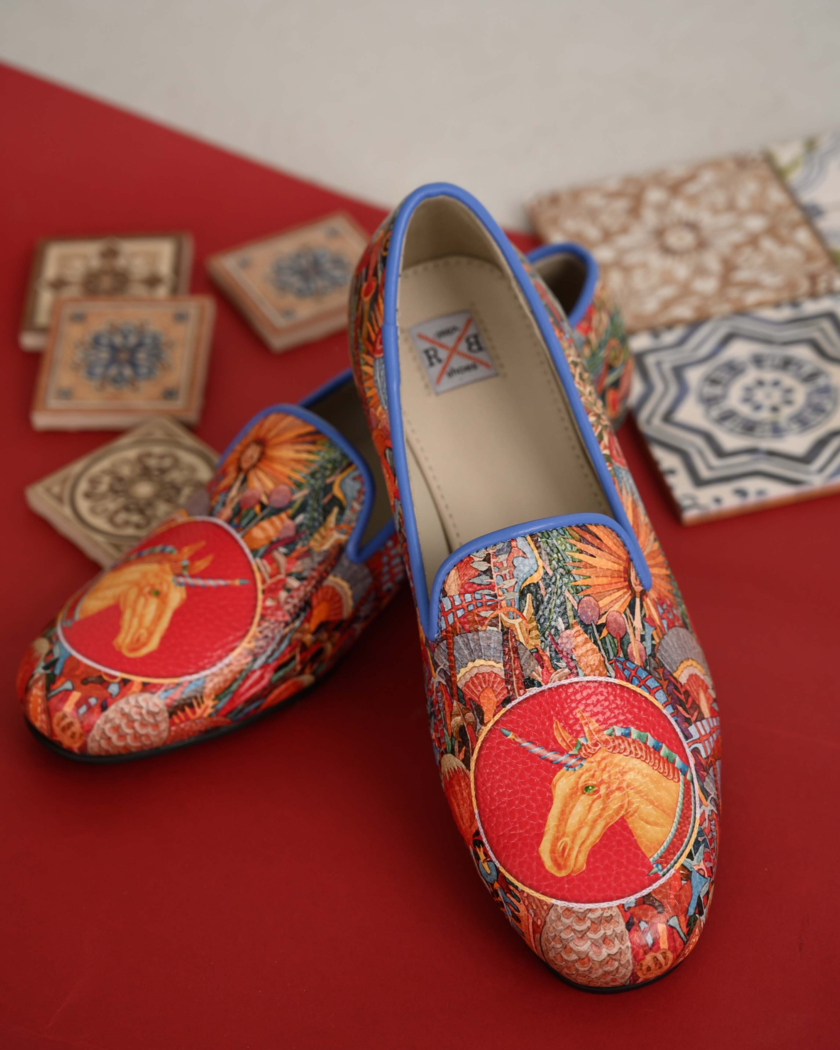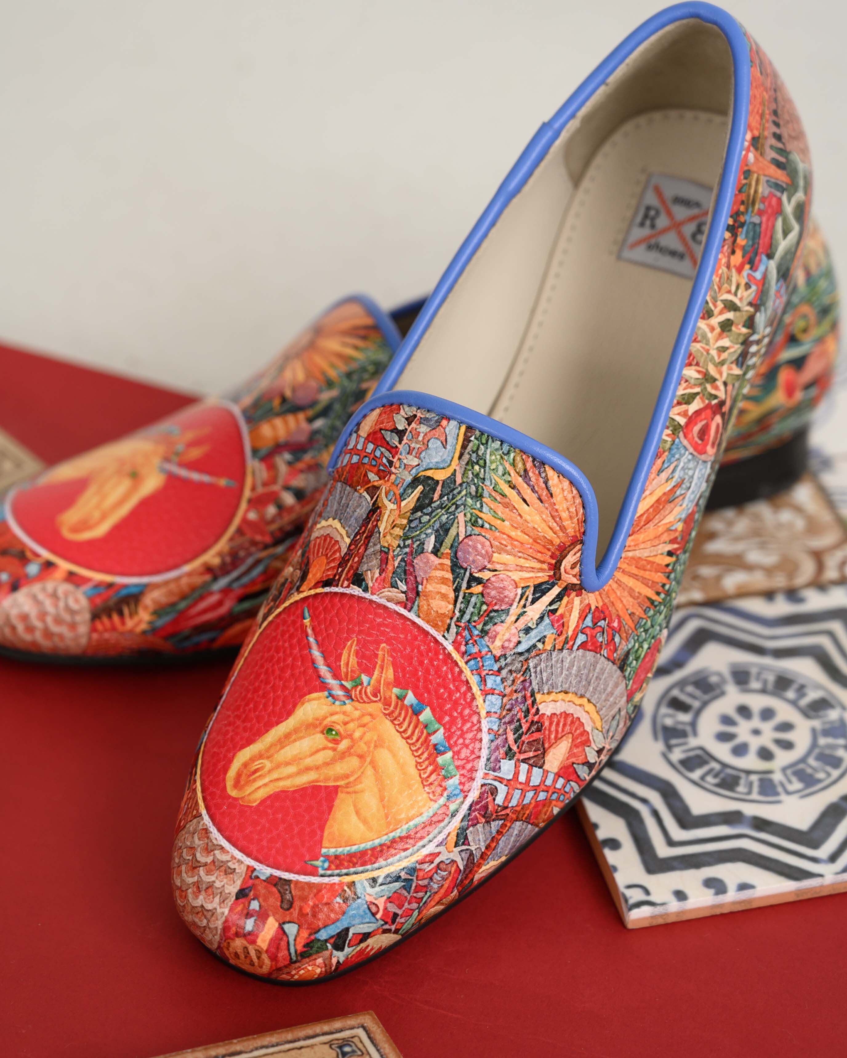 Слиперы для дома и улицы "Единорог счастья" созданы по мотивам картины К. Овчинникова. Уникальный принт нанесен на мягчайшую итальянскую кожу, создавая яркий, но универсальный образ.