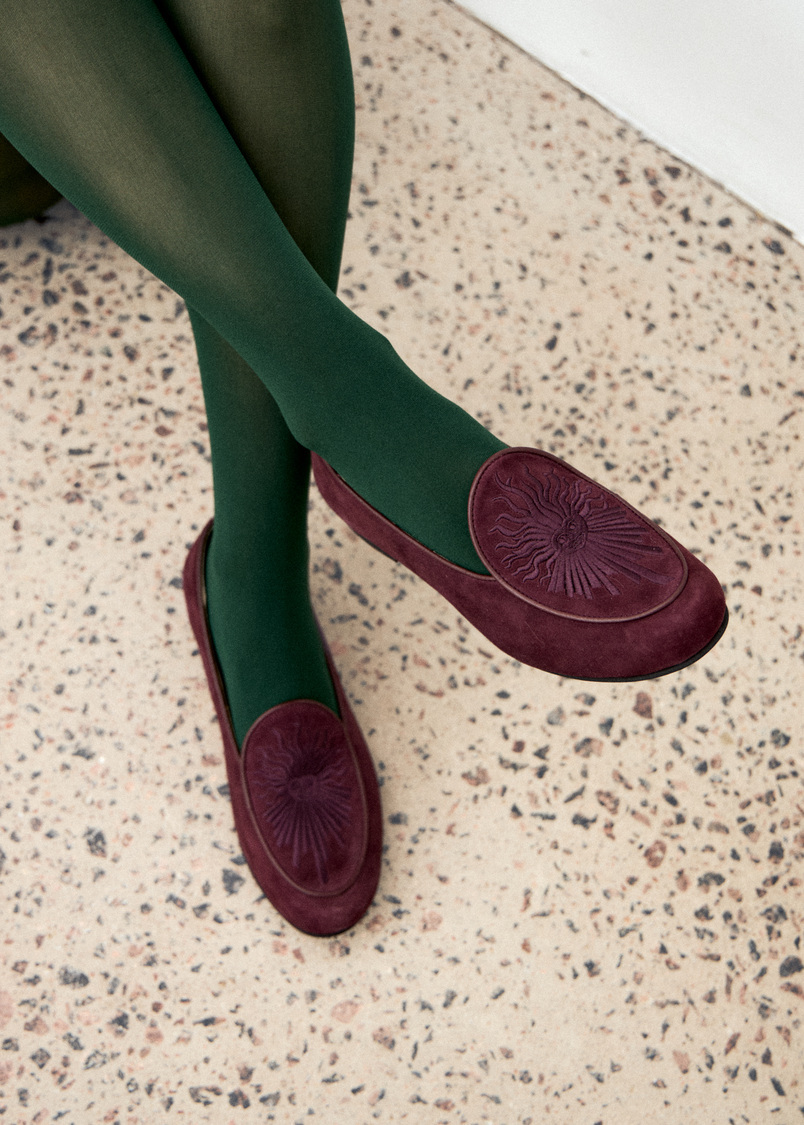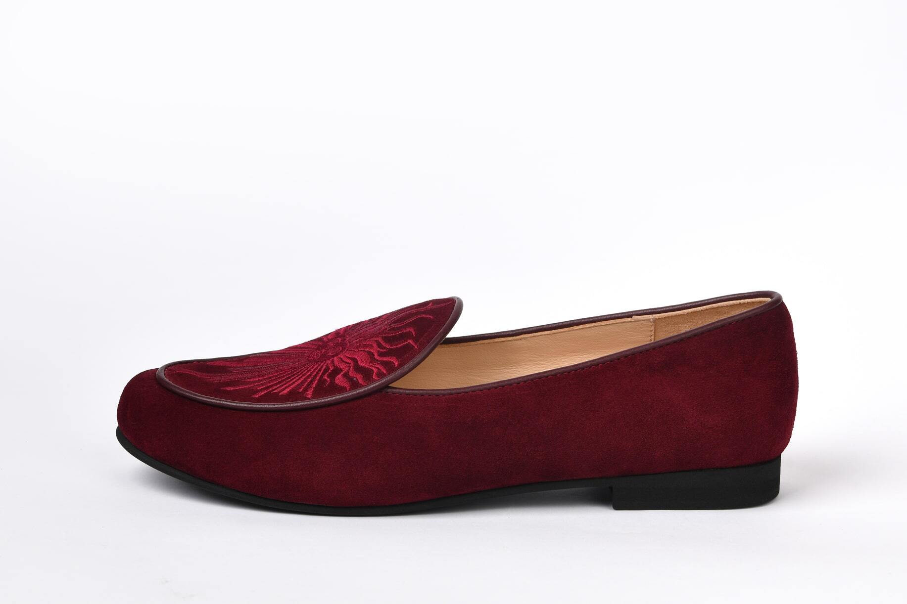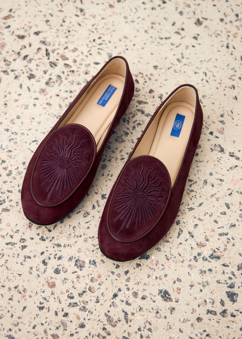 Женские слипперы из изысканной бордовой замши отсылают к эмблеме Людовика XIV — Короля-Солнце.