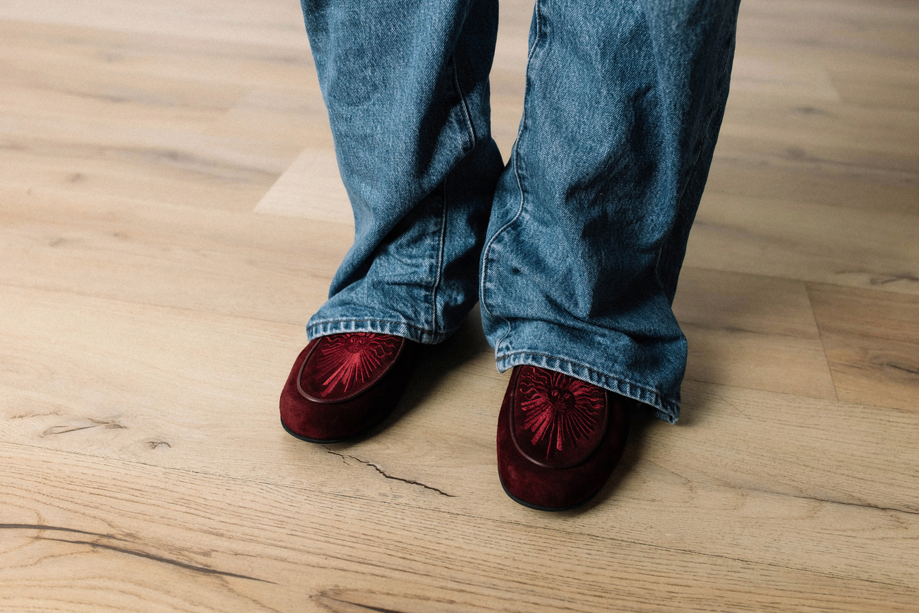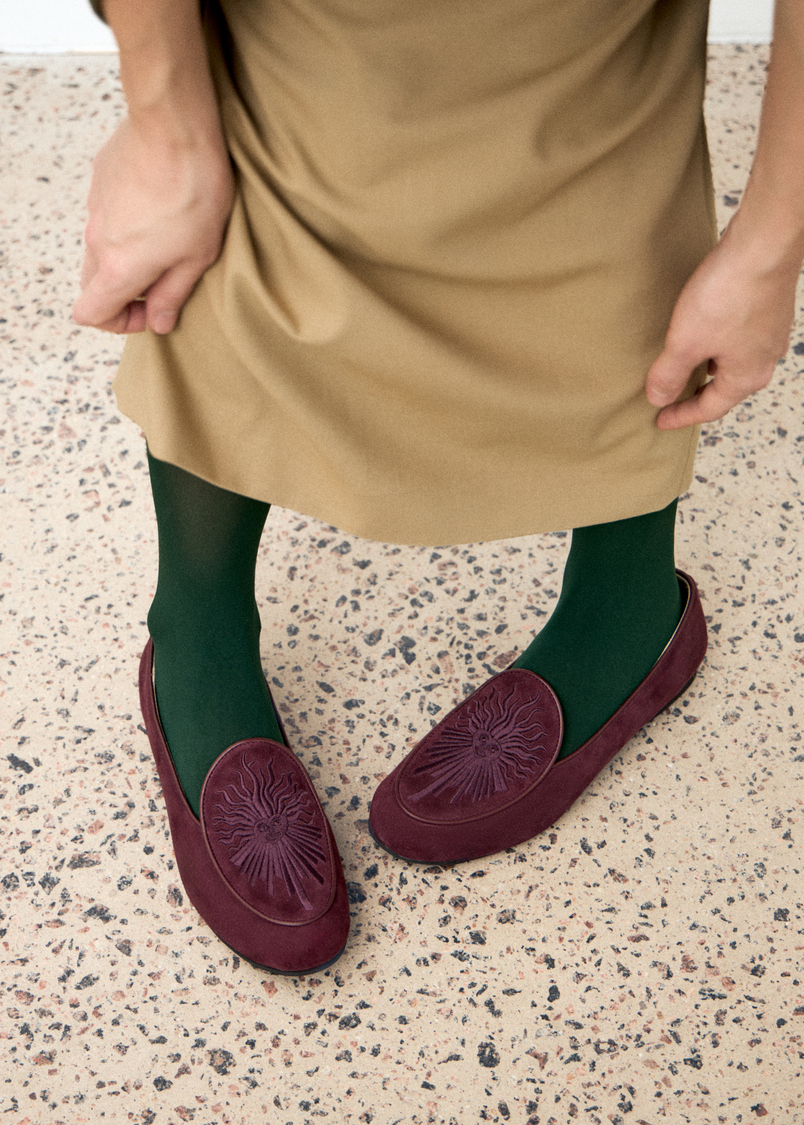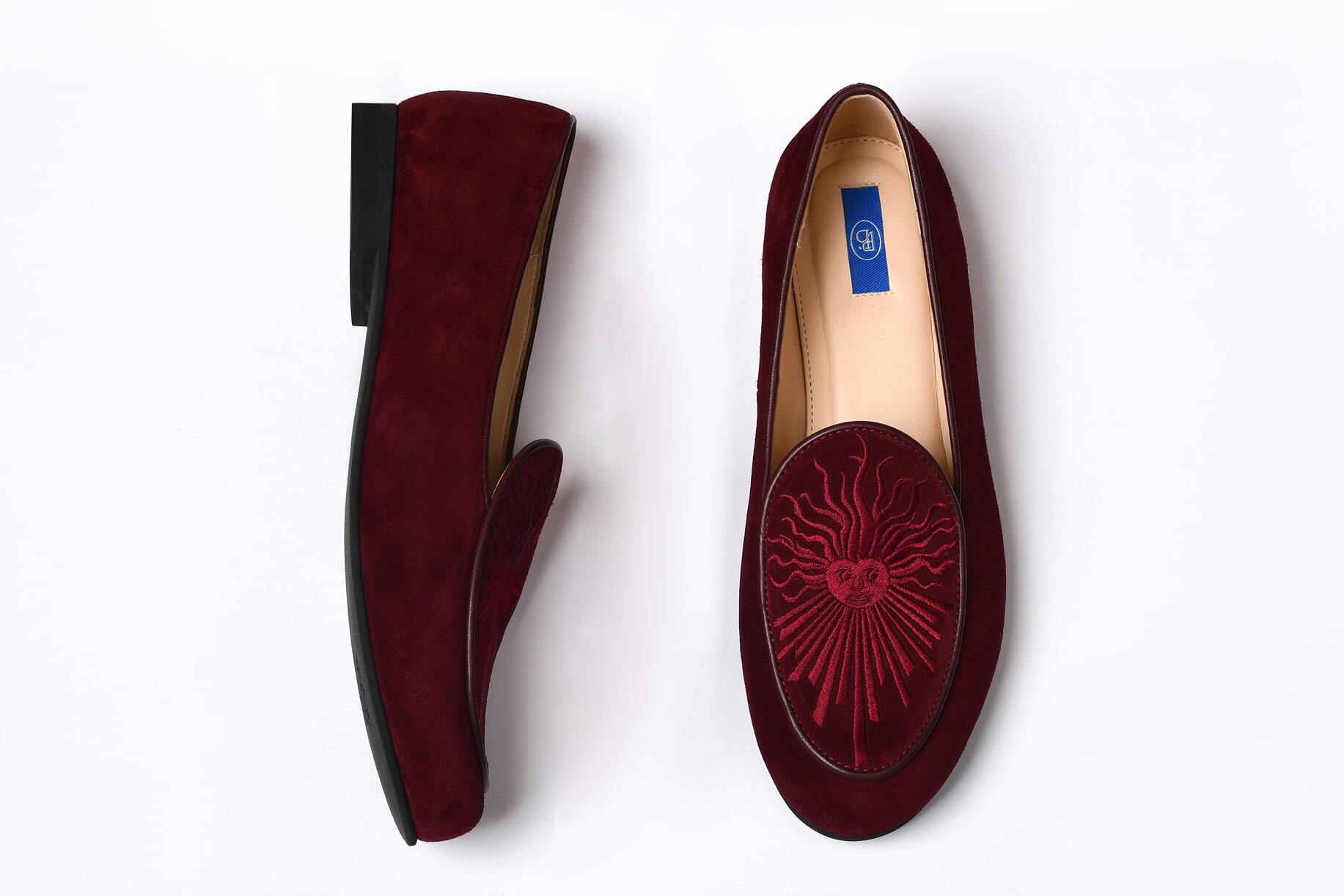 Женские слипперы из изысканной бордовой замши отсылают к эмблеме Людовика XIV — Короля-Солнце.