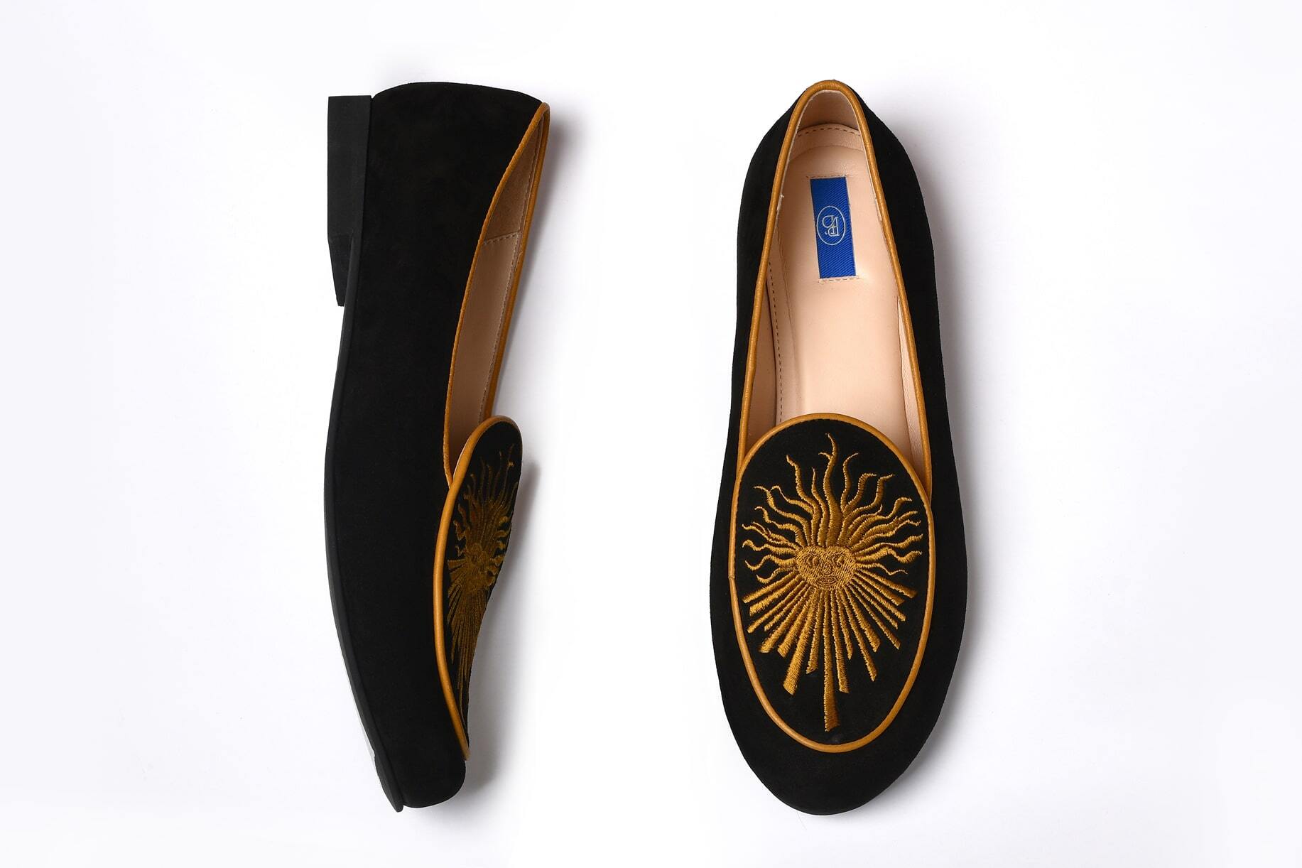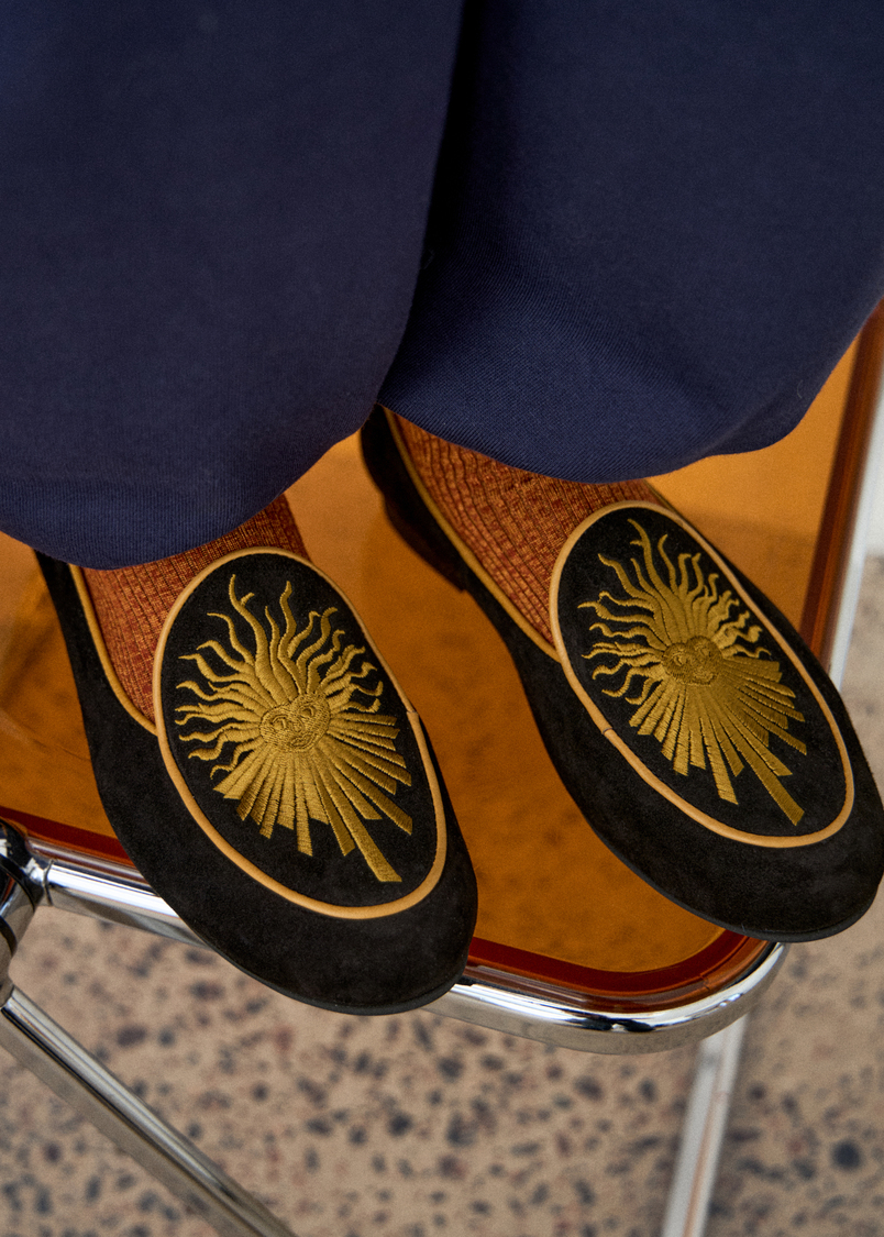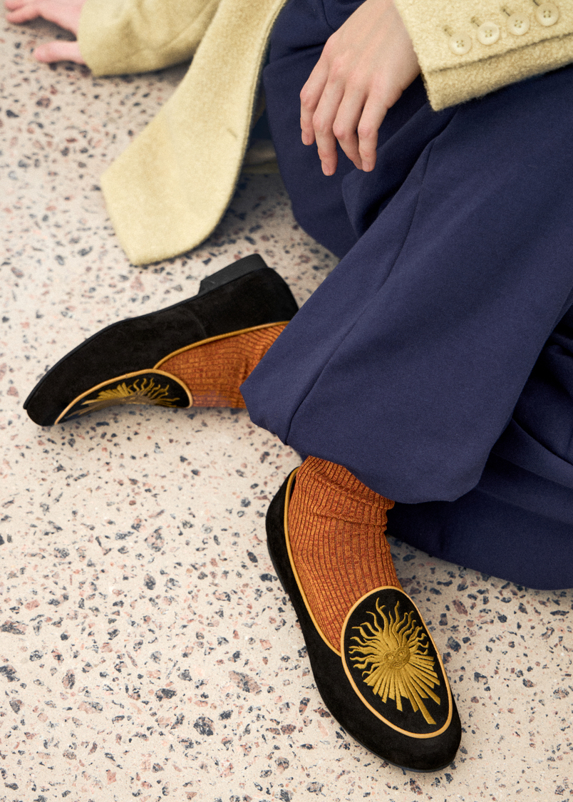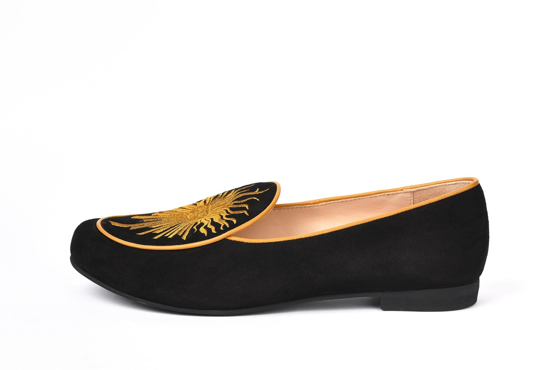 Женские слипперы из изысканной черной замши отсылают к эмблеме Людовика XIV — Короля-Солнце.