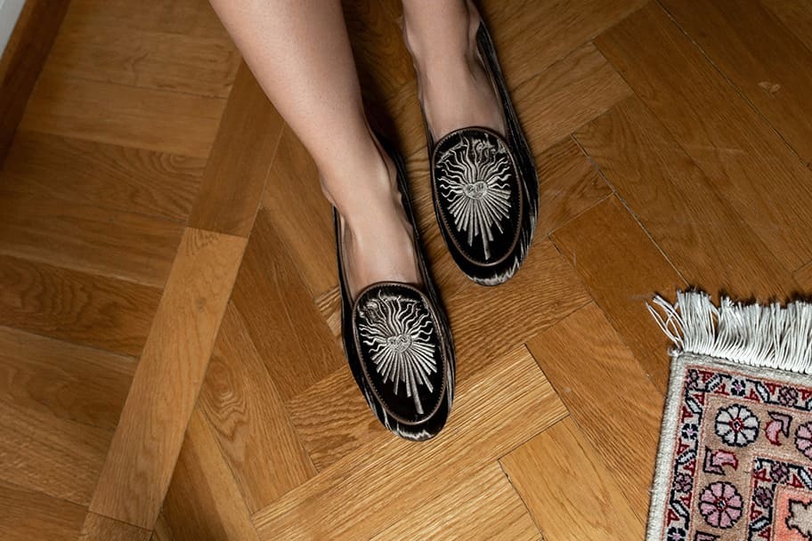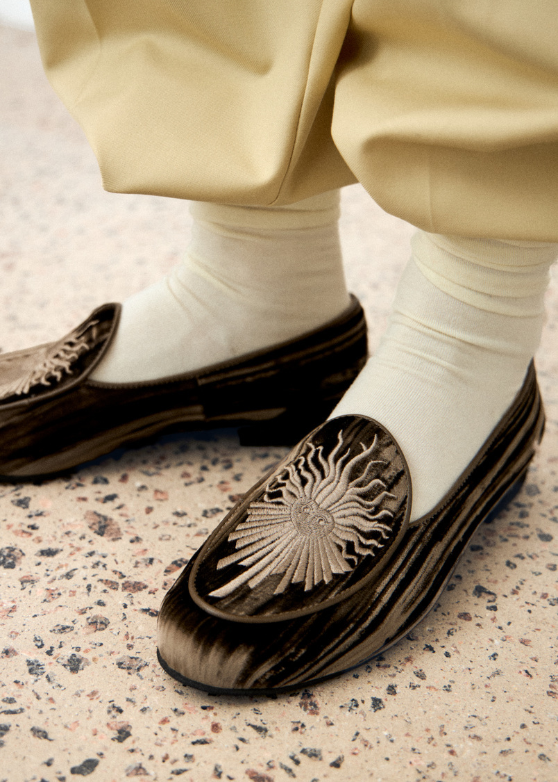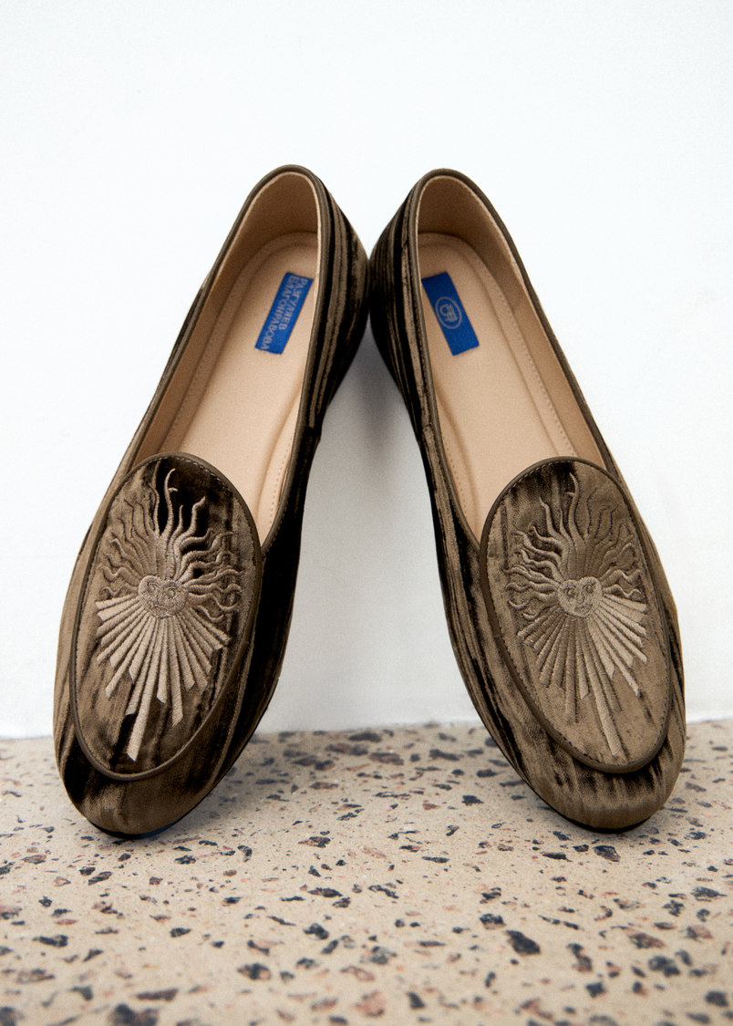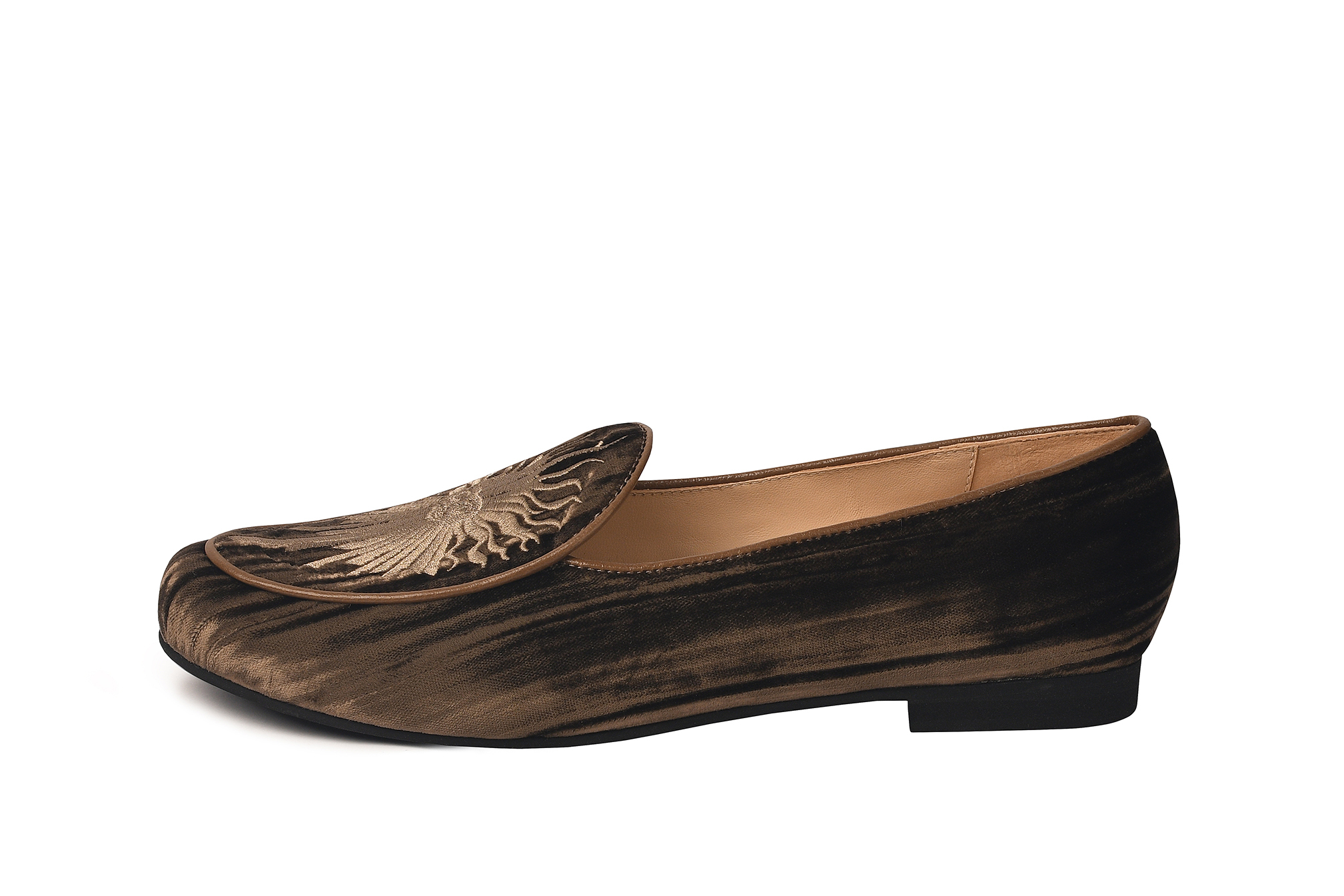 Женские слипперы из изысканного французского бархата отсылают к эмблеме Людовика XIV — Короля-Солнце.