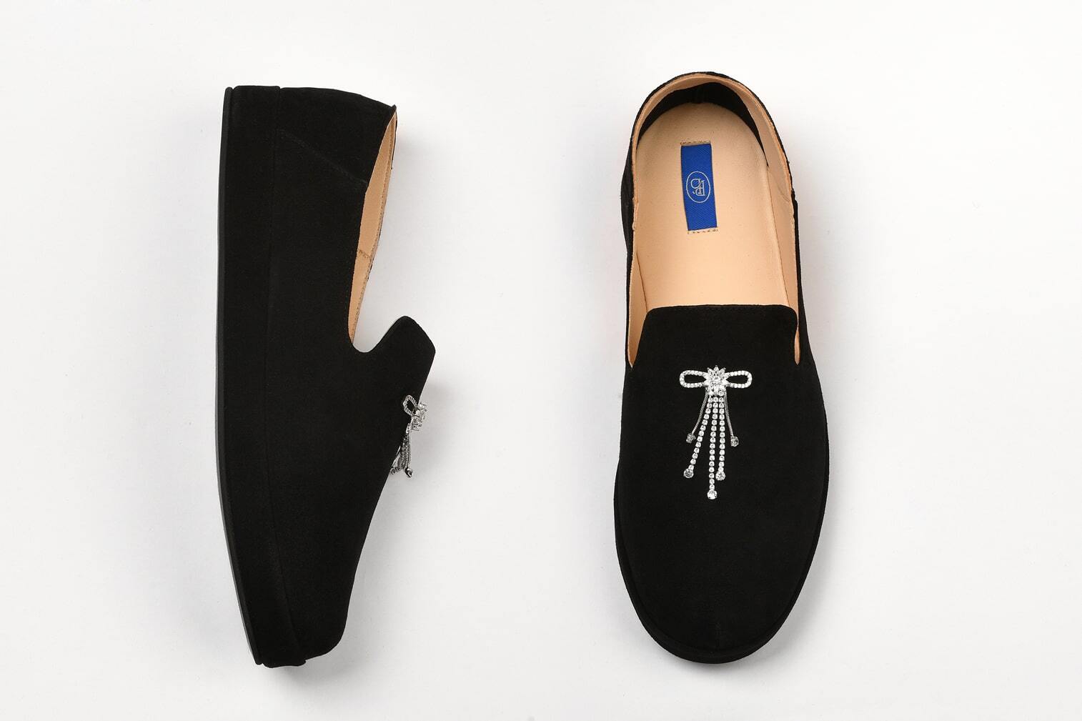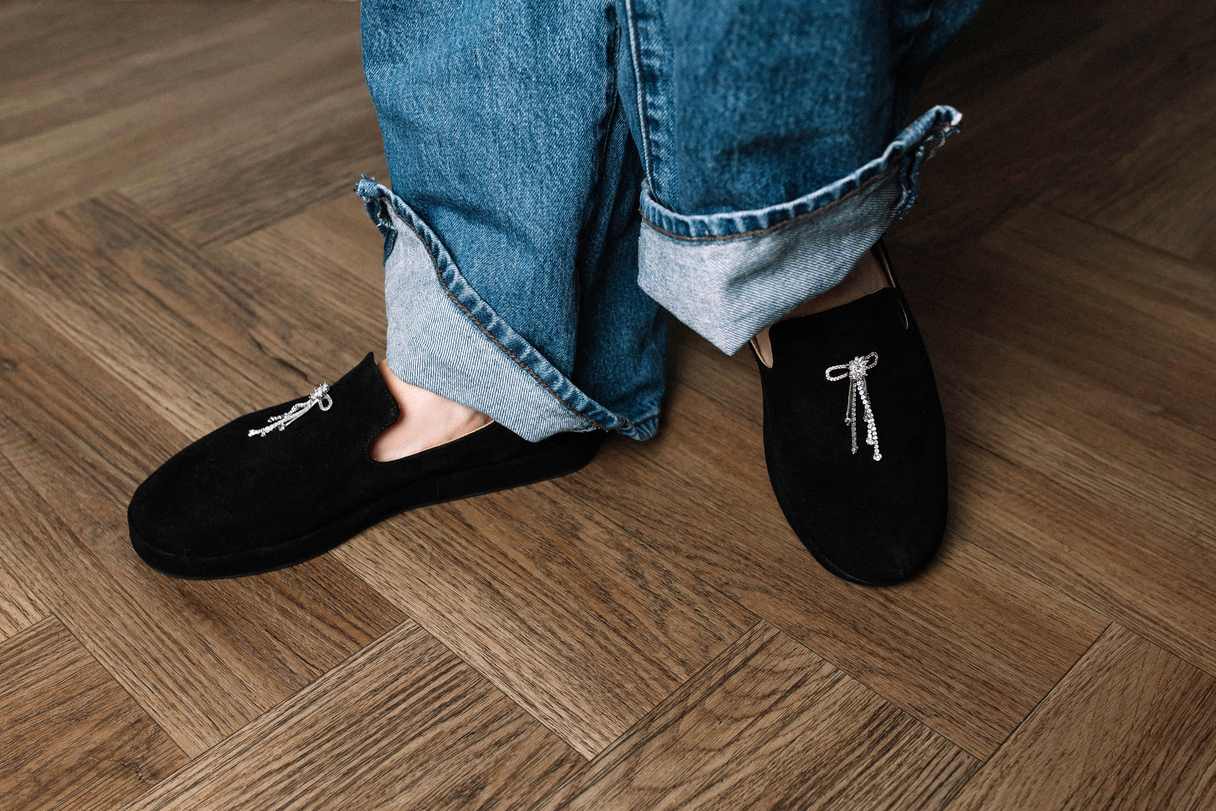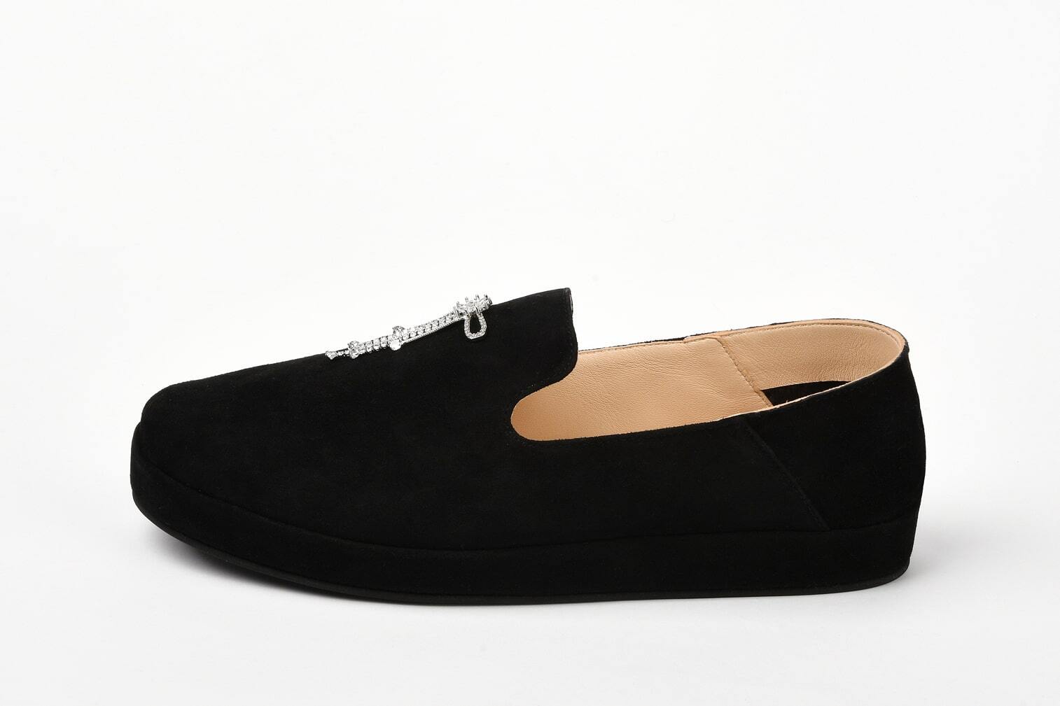 Праздничные уличные слипоны из тончайшей итальянской замши. Модель декорирована металлической брошью с ограненным стеклом, что придает ей особый шарм и элегантность. Удобство ношения как с пяткой, так и без нее делает эти тапочки идеальным выбором для дома и улицы, а так же подходит на осень.