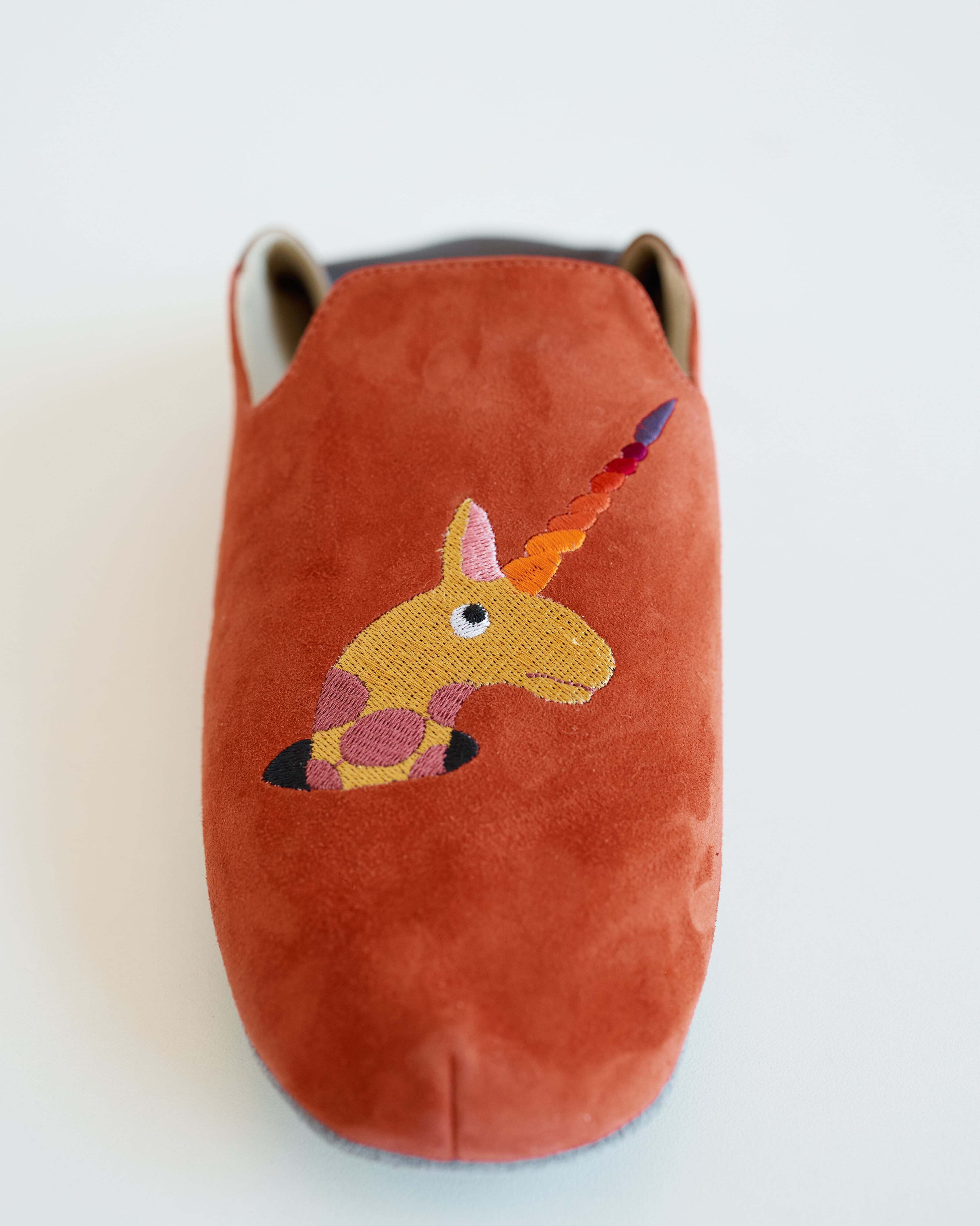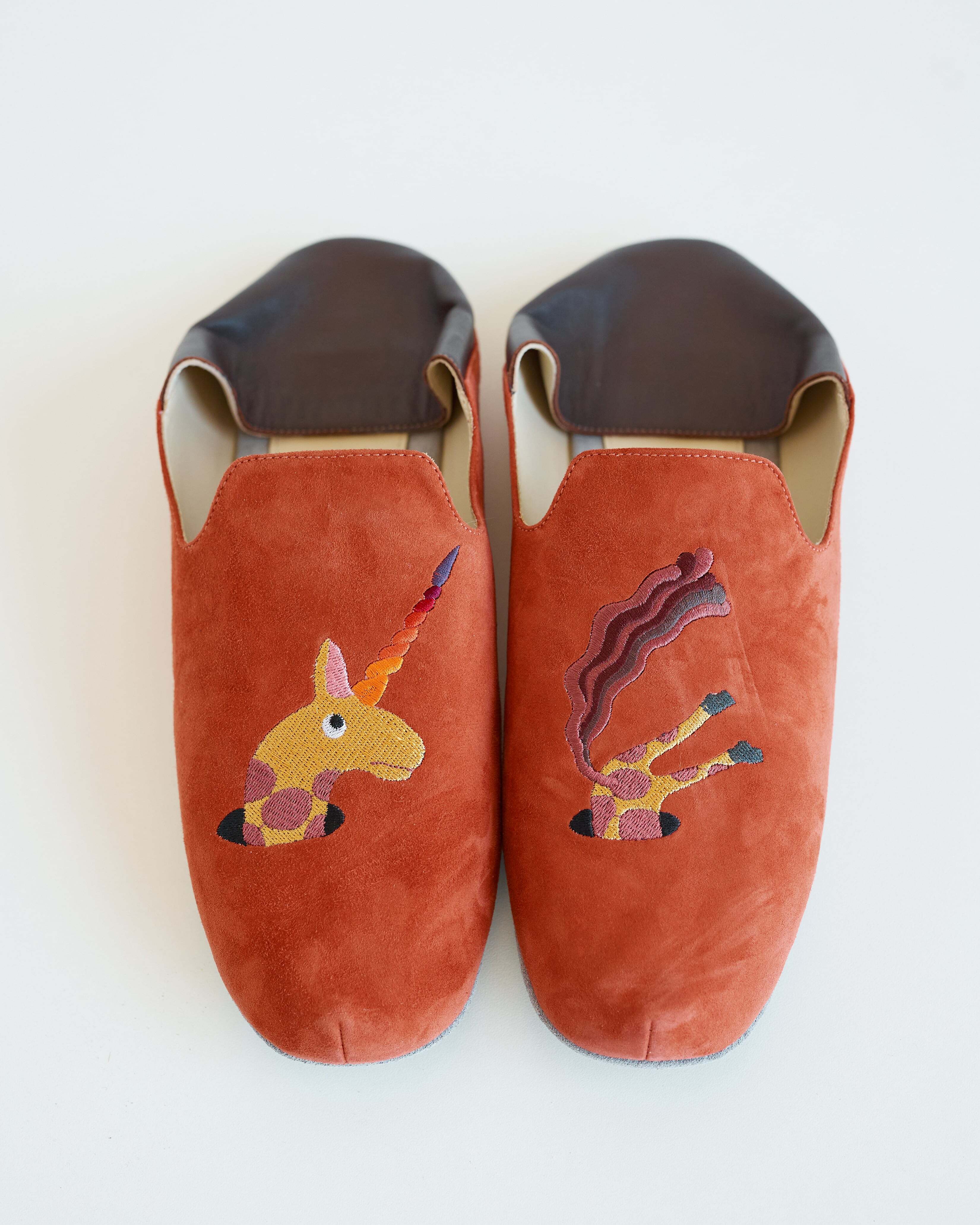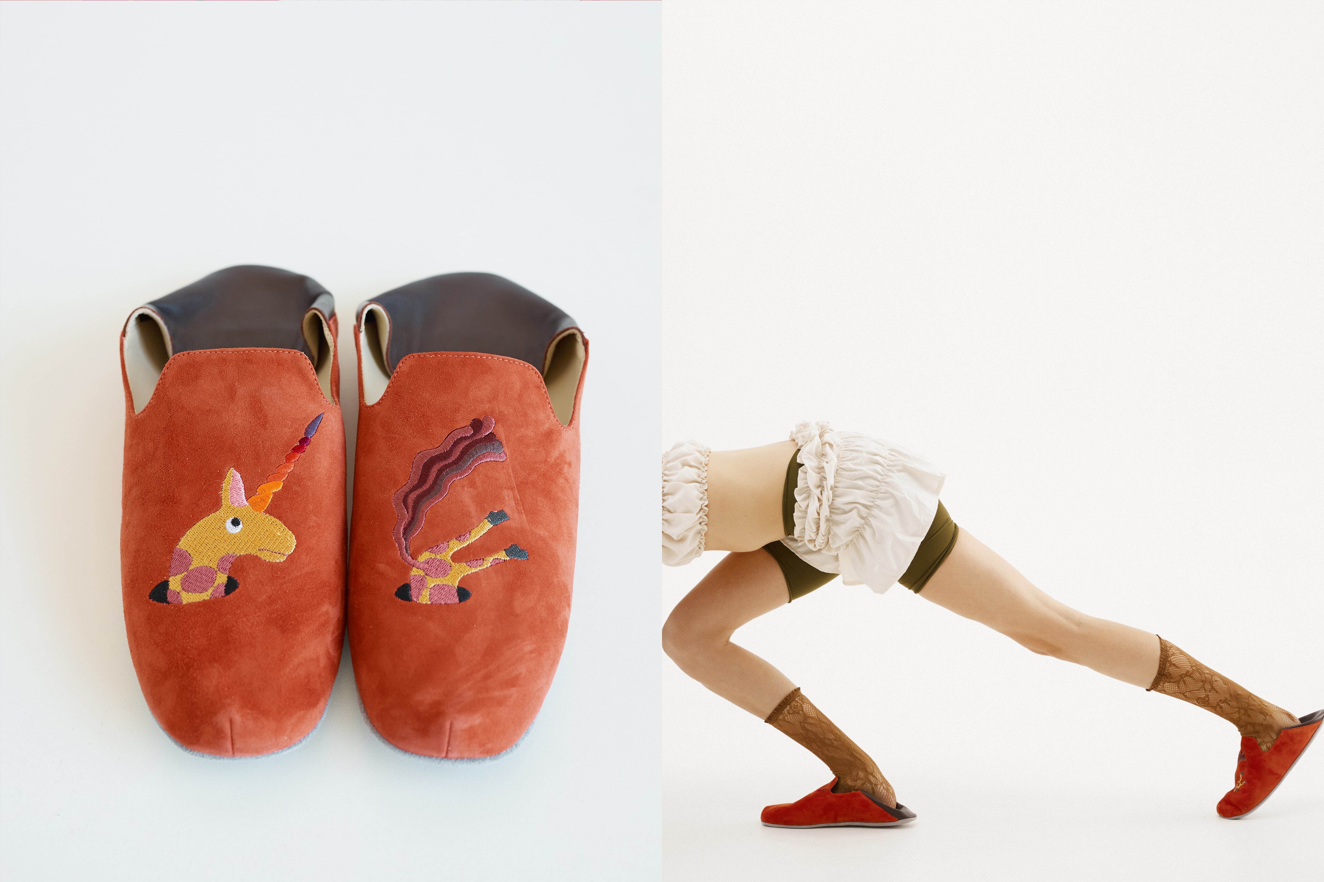 Домашние кожаные тапочки c вышивкой из коллаборации с театральным художником Сергеем Кретенчуком - это путешествие в мир любимых с детства мультфильмов с философскими сюжетами.
