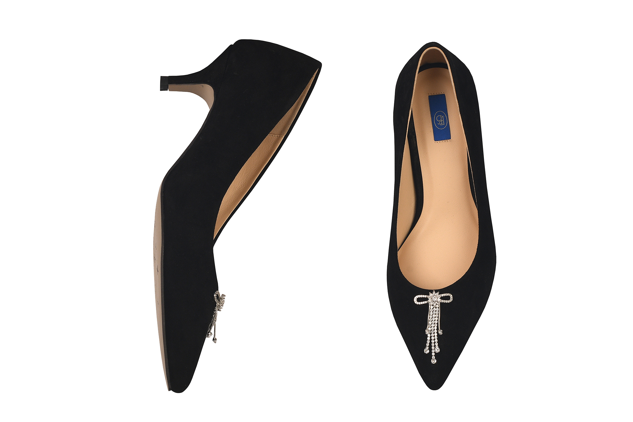 Роскошь, которую можно носить каждый день. Глубокая чёрная замша премиум-класса, бархатистая и благородная, устойчивый kitten heel 5,5 см, идеальная колодка и фиксированная брошь-бантик с кристаллами — маленькая деталь, которая делает пару по-настоящему особенной.