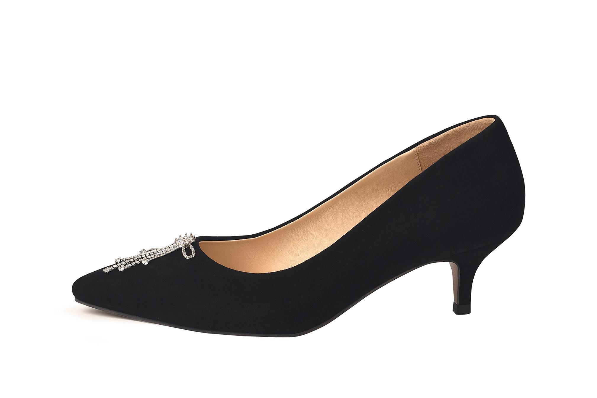 Роскошь, которую можно носить каждый день. Глубокая чёрная замша премиум-класса, бархатистая и благородная, устойчивый kitten heel 5,5 см, идеальная колодка и фиксированная брошь-бантик с кристаллами — маленькая деталь, которая делает пару по-настоящему особенной.
