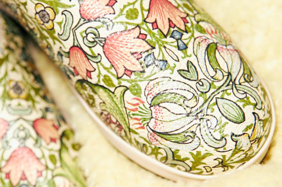 Уютные и мягкие кожаные клоги (это новая версия домашних тапочек, которые можно и нужно носить на улицу) поднимут настроение. В дизайне использованы мотивы творчества художника и основателя направления "Arts and Crafts" Вильяма Морриса. Это Ваш предмет искусства в интерьере и отличный подарок.