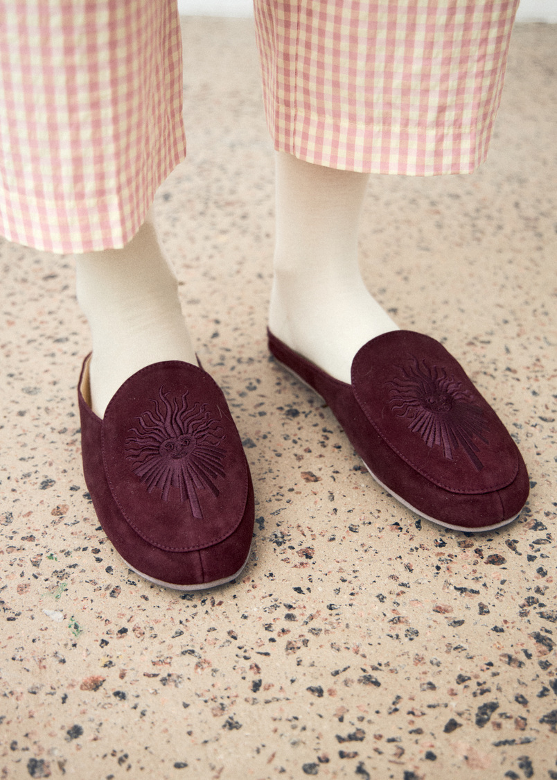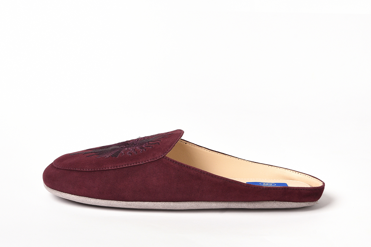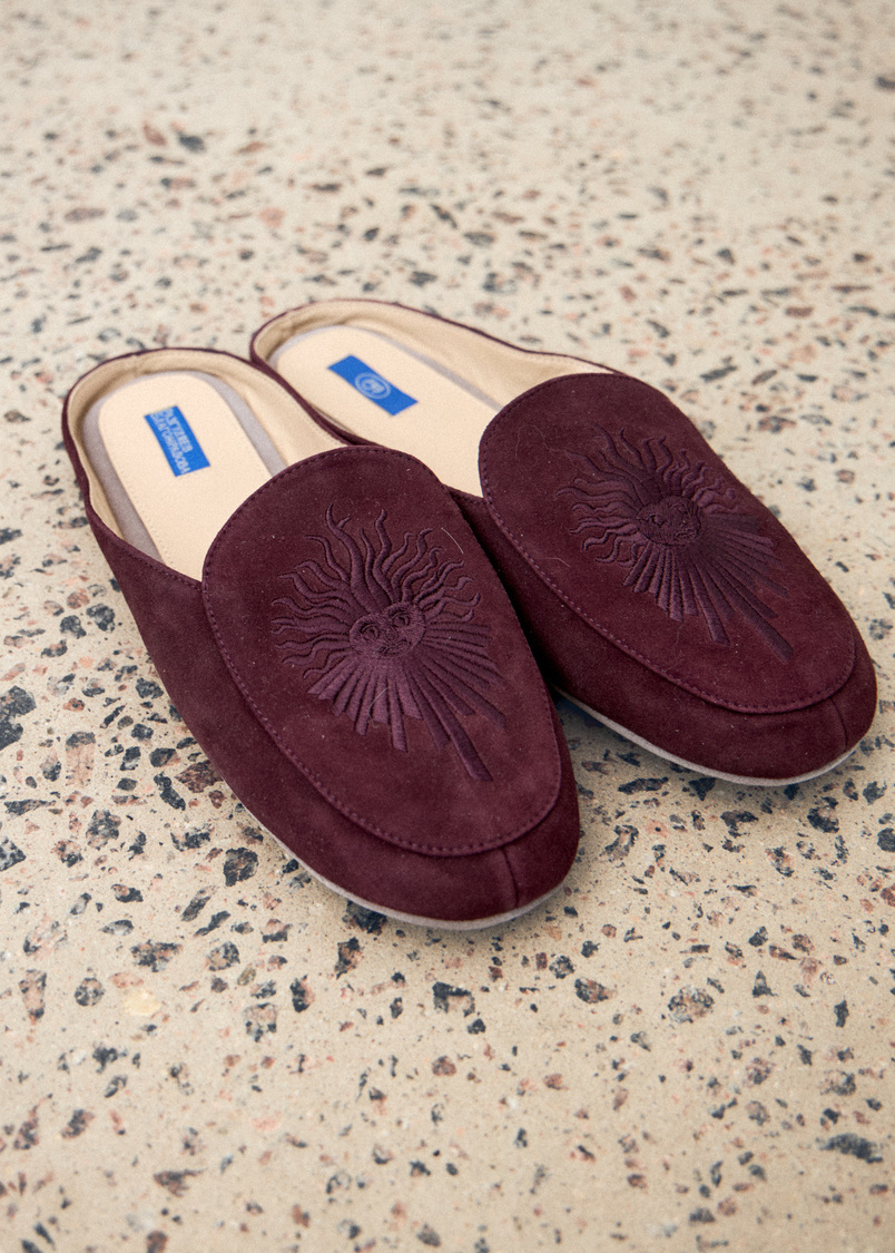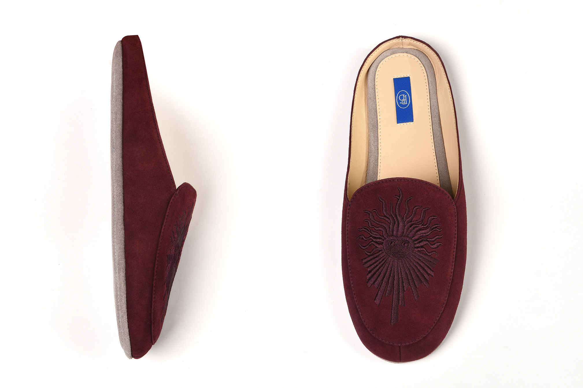 Тапочки из изысканной бордовой замши отсылают к эмблеме Людовика XIV — Короля-Солнце.