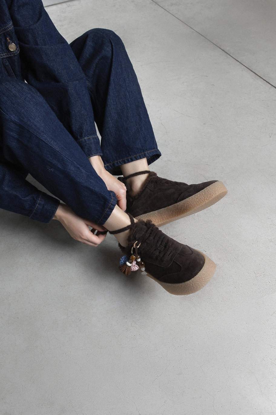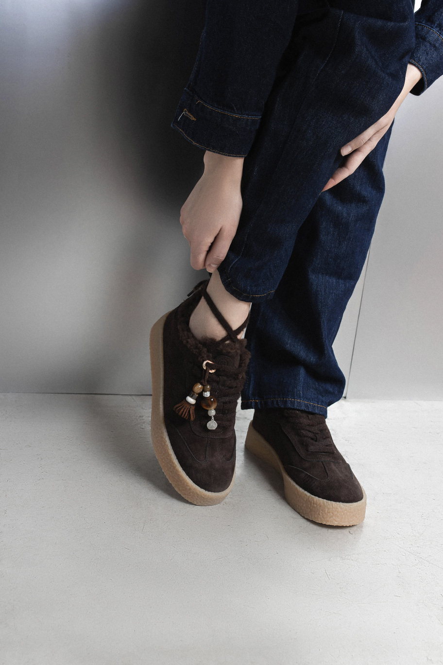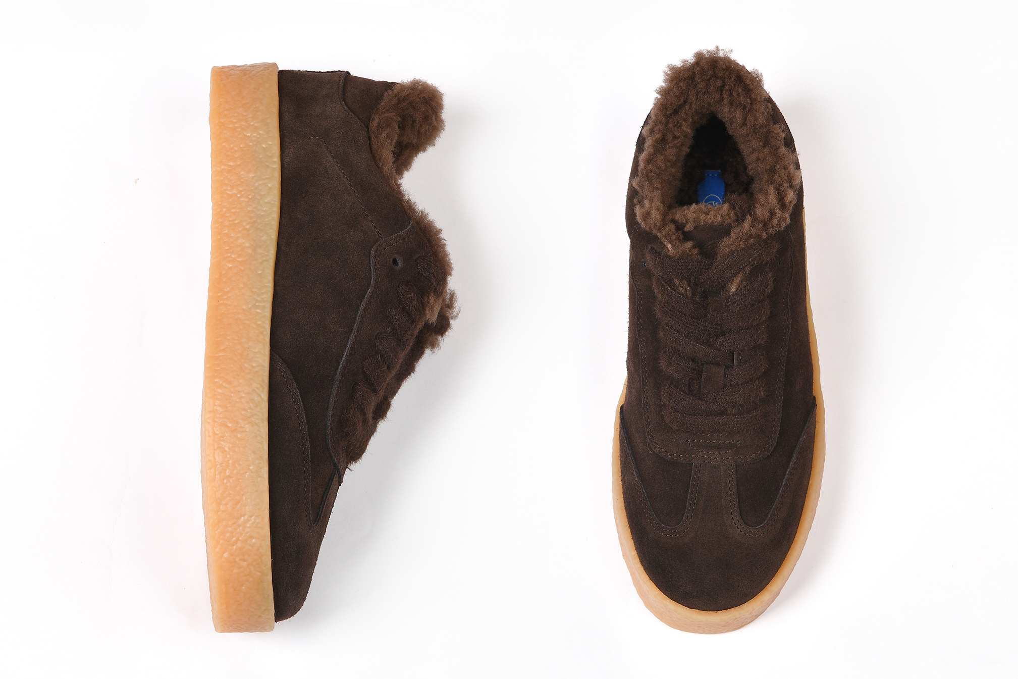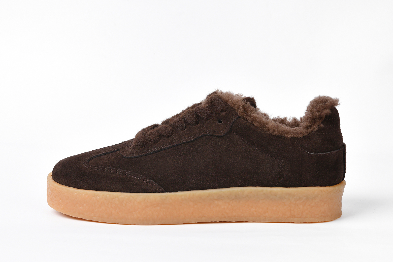 Горький шоколад для самых холодных дней. Глубокая тёмно-коричневая замша премиум-класса, густой натуральный мех овчины внутри, карамельная подошва и пушистый отворот — это те кеды, в которых зима становится уютной.
