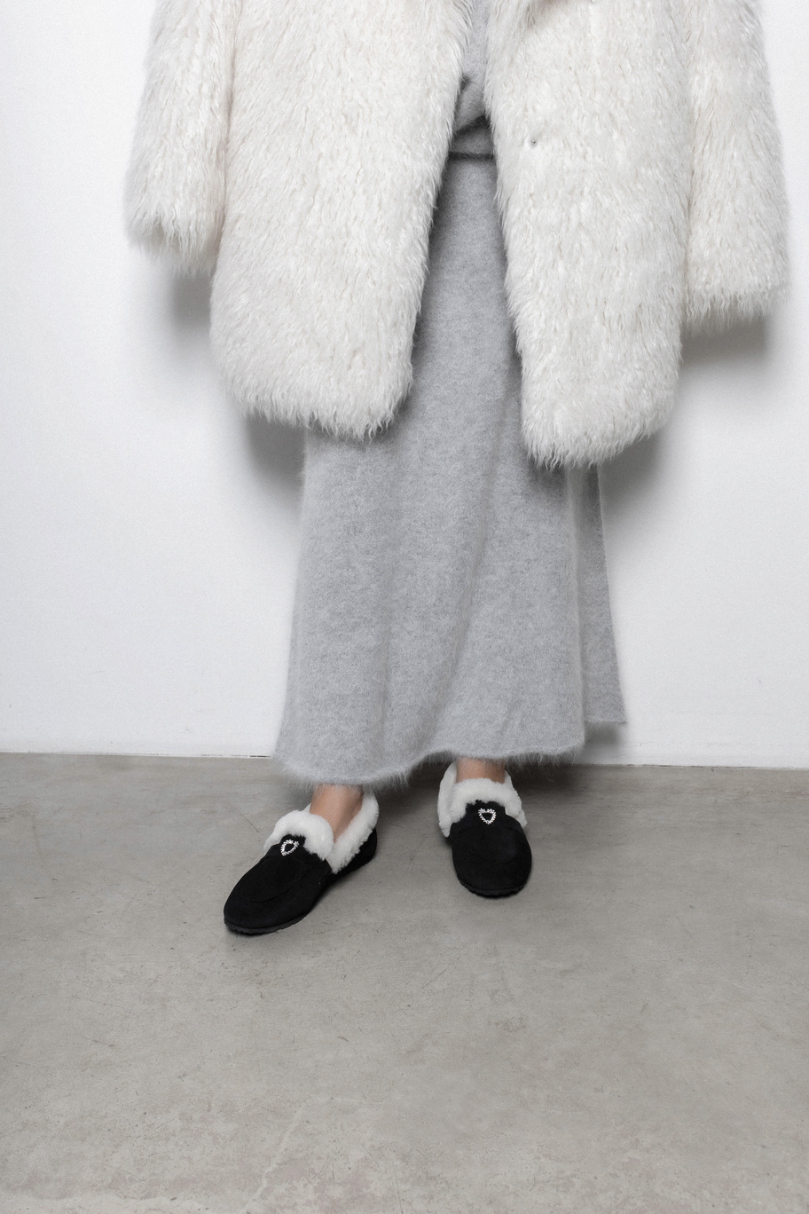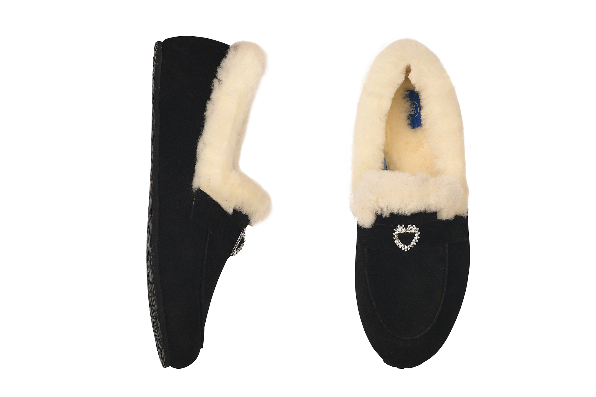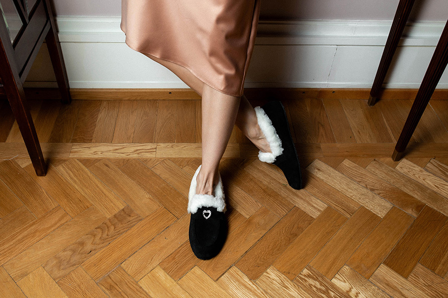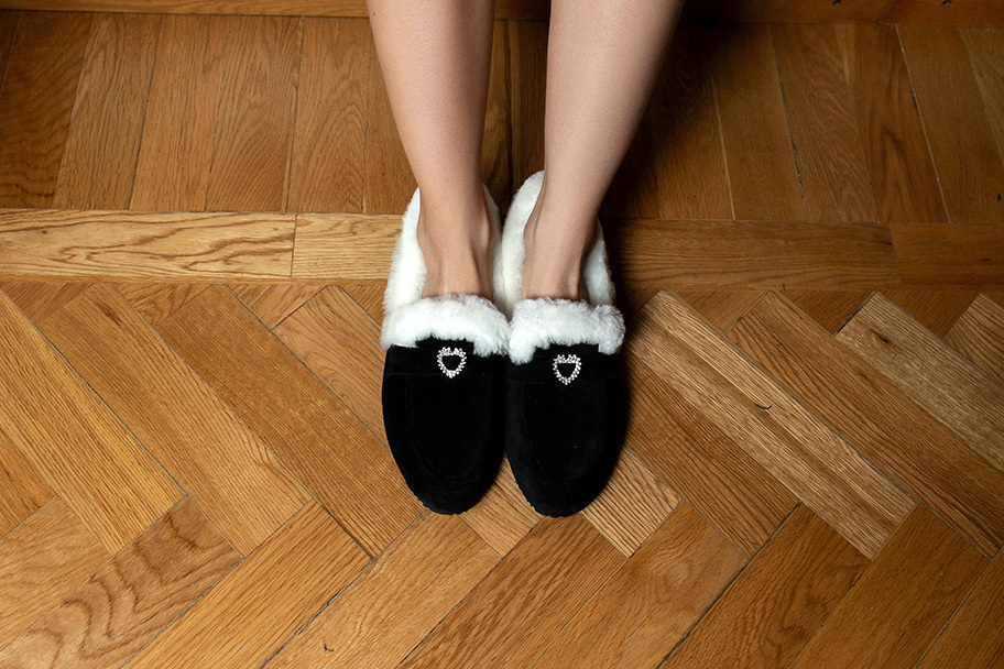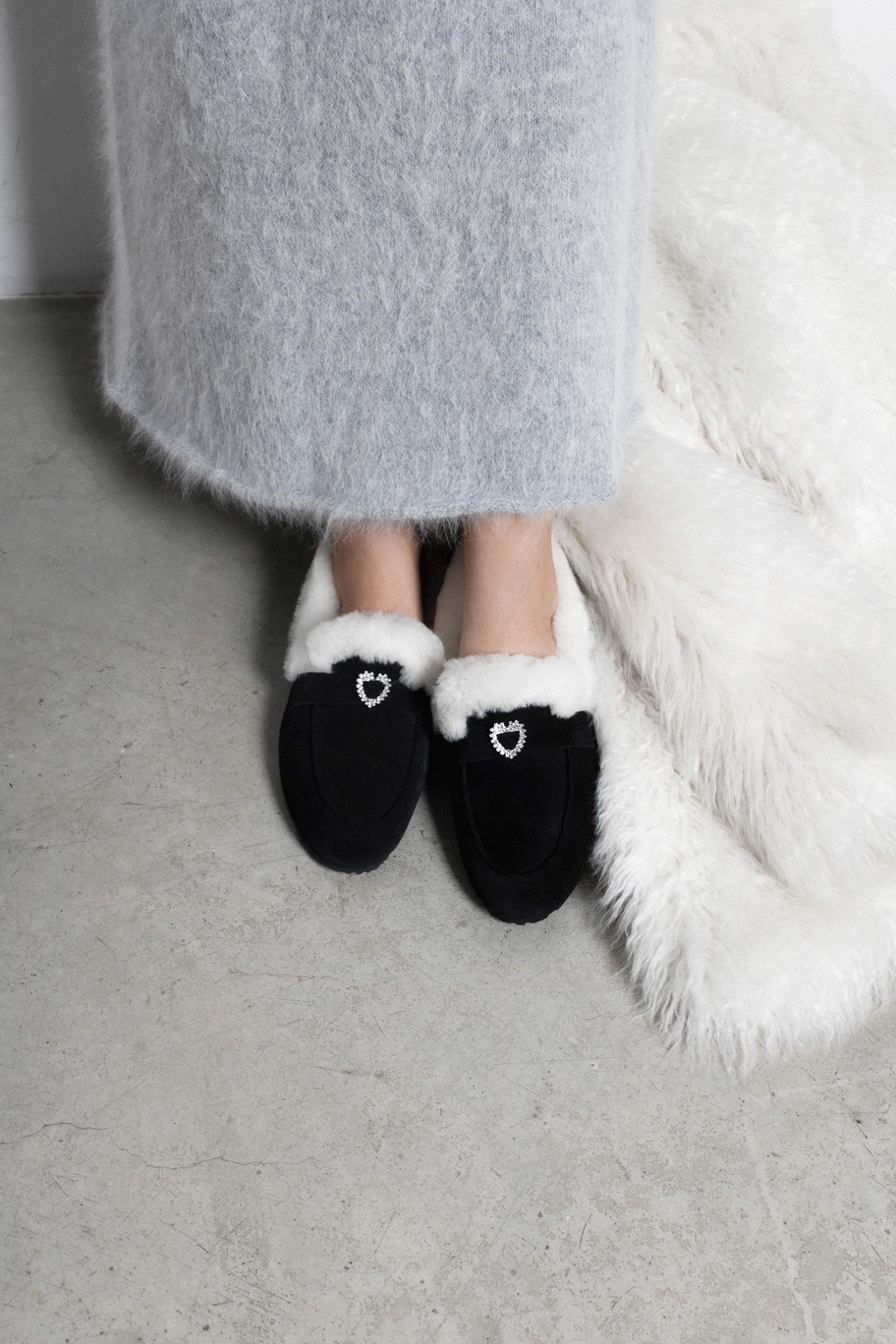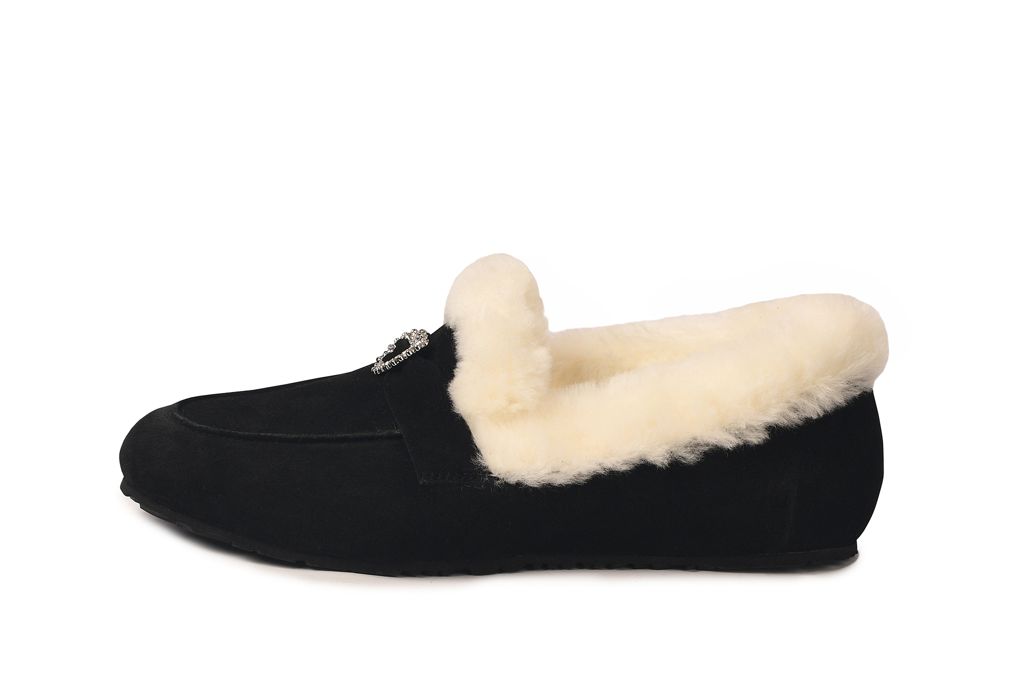 Классика, в которой мороз не страшен. Глубокая чёрная замша премиум-класса, белоснежный густой мех по краю и тонкая сверкающая пряжка с кристаллами — это те лоферы, которые превращают любой зимний образ в безупречный,уютный и нарядный.