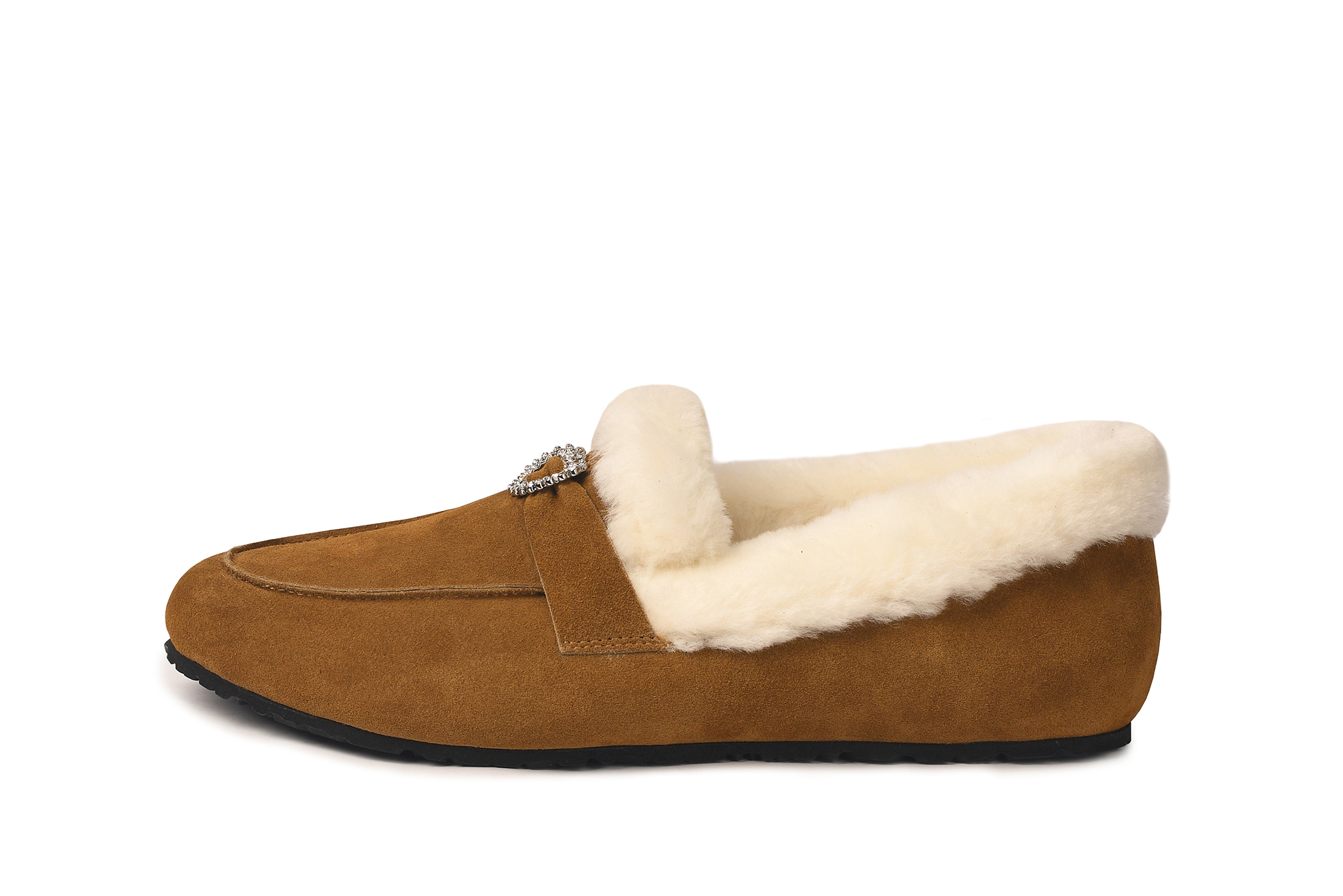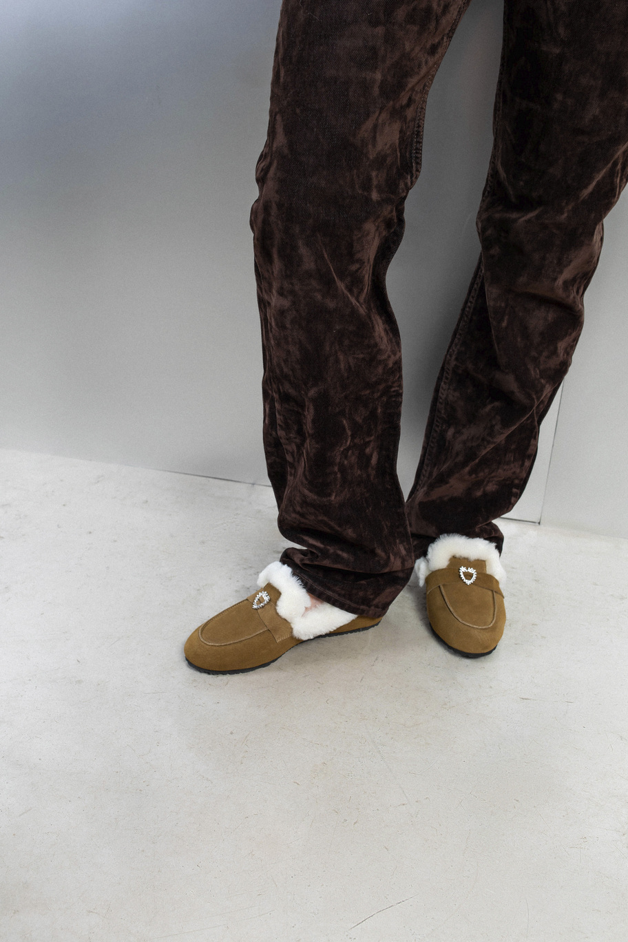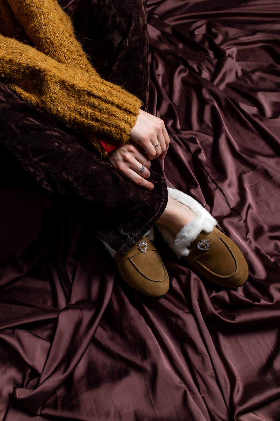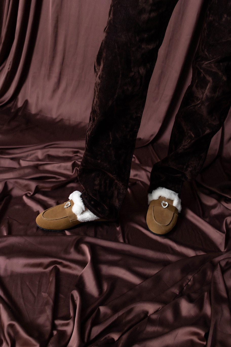 Тепло, статусно и с лёгким сиянием. Насыщенный коньячно-карамельный цвет премиальной замши, плотный белоснежный мех овчины по всему внутреннему краю и тонкая сверкающая пряжка с кристаллами — эти лоферы созданы для тех, кто даже в мороз хочет выглядеть дорого и женственно.